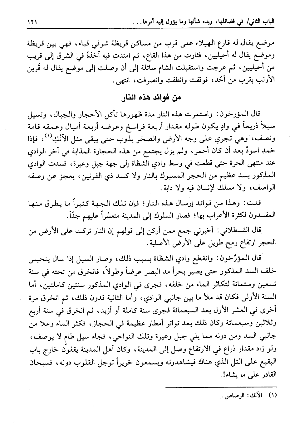 وقال القسطلاني: إن ضوءها استوى على ما بطن من القيعان «1» ، وظهر من القلاع، حتى كأن الحرم النبوي عليه الشمس مشرقة، وجملة أماكن المدينة بأنوارها محدقة، ودام على ذلك لهبها حتى تأثر له النيران، وصار نور الشمس على الأرض تعتريه صفرة، ولونها من تصاعد الالتهاب يعتريه حمرة، والقمر كأنه قد كسف من اضمحلال نوره، قال: