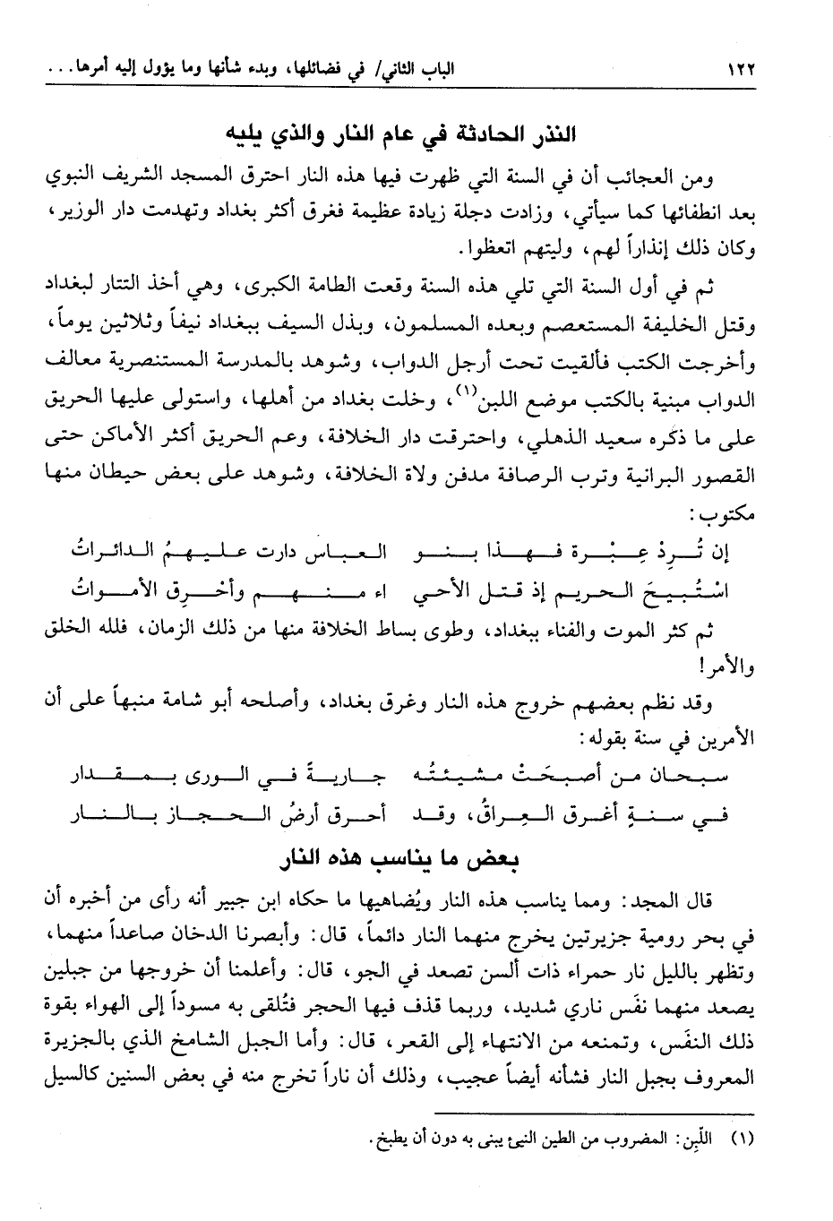 بصرى أنه أخبره غير واحد من الأعراب صبيحة الليلة التي ظهرت فيها هذه النار ممن كان يحاضره ببلد بصرى أنهم رأوا صفحات أعناق إبلهم في ضوء تلك النار، فقد تحقق بذلك أنها الموعود بها، والحكمة في إنارتها بالأماكن البعيدة من هذا المظهر الشريف حصول الإنذار، ليتم به الانزجار، كما اتفق لأهل المدينة، وفي هذا المعنى يقول قائلهم:
