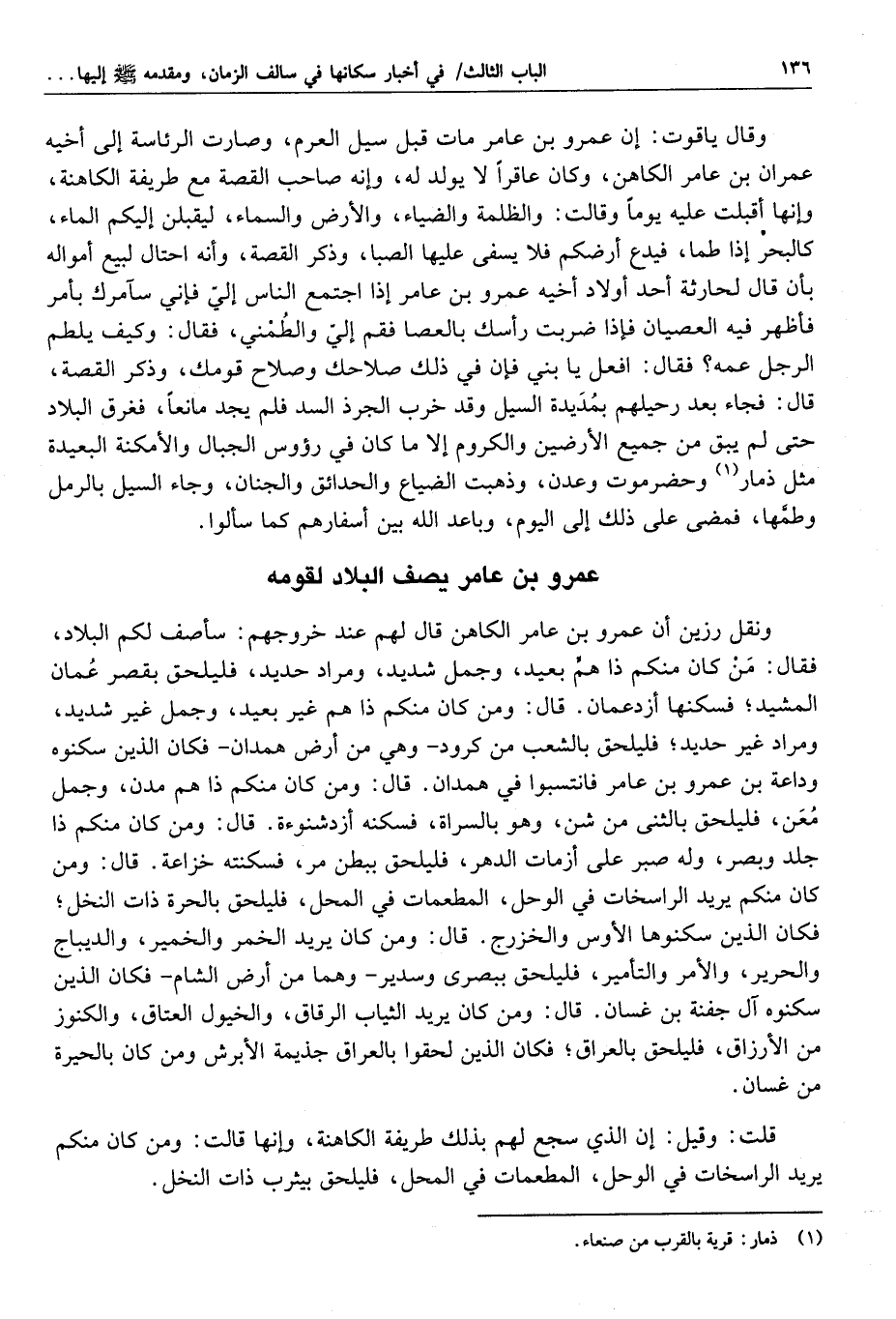 ونقل رزين أنه كان أول شيء وقع بمأرب من أمر سيل العرم أن عمران بن عامر رأى في كهانته أن قومه سيمزقون ويباعد بين أسفارهم، وأن بلادهم ستخرب، فذكر ذلك لأخيه عمرو بن عامر؛ فكان بين التصديق والتكذيب، فبينا طريفة امرأته ذات يوم نائمة إذ رأت فيما يرى النائم أن سحابة غشيت أرضهم فأرعدت وأبرقت، فذعرت ذعرا شديدا، فسكّنوها، فقالت: يا عمرو بن عامر، الذي رأيت في الغيم، أذهب عني النوم، رأيت غيما أرعد وأبرق، طويلا ثم أصعق، فما وقع على شيء إلا احترق؛ فما بعده إلا الفرق «1» ، فلما رأوا ما بها خفضوها «2» حتى سكنت، ثم إن عمرو بن عامر دخل حديقة ومعه جاريتان له، فبلغ ذلك طريفة خرجت نحوه، فلما خرجت من بيتها عارضها ثلاث مناجذ- وهي دواب تشبه اليرابيع- منتصبات على أرجلهن واضعات أيديهن على أعينهن، فلما رأتهن طريفة وضعت يدها على عينها وقعدت على الأرض، فلما ذهبت المناجذ خرجت مسرعة، فلما عارضها خليج الحديقة التي فيها عمرو وثبت من الماء سلحفاة فوقعت في الطريق على ظهرها، وجعلت تروم «3» الانقلاب وتستعين بيدها فلا تستطيع، فتحذف التراب على نفسها، وتقذف بالبول من تحتها، فلما رأت طريفة ذلك جلست على الأرض حتى عادت السلحفاة إلى الماء، ثم مضت طريفة حتى دخلت الحديقة التي فيها عمرو بن عامر حين انتصف النهار في ساعة شديد حرها، وإذا الشجرة من غير ريح تتكفأ،