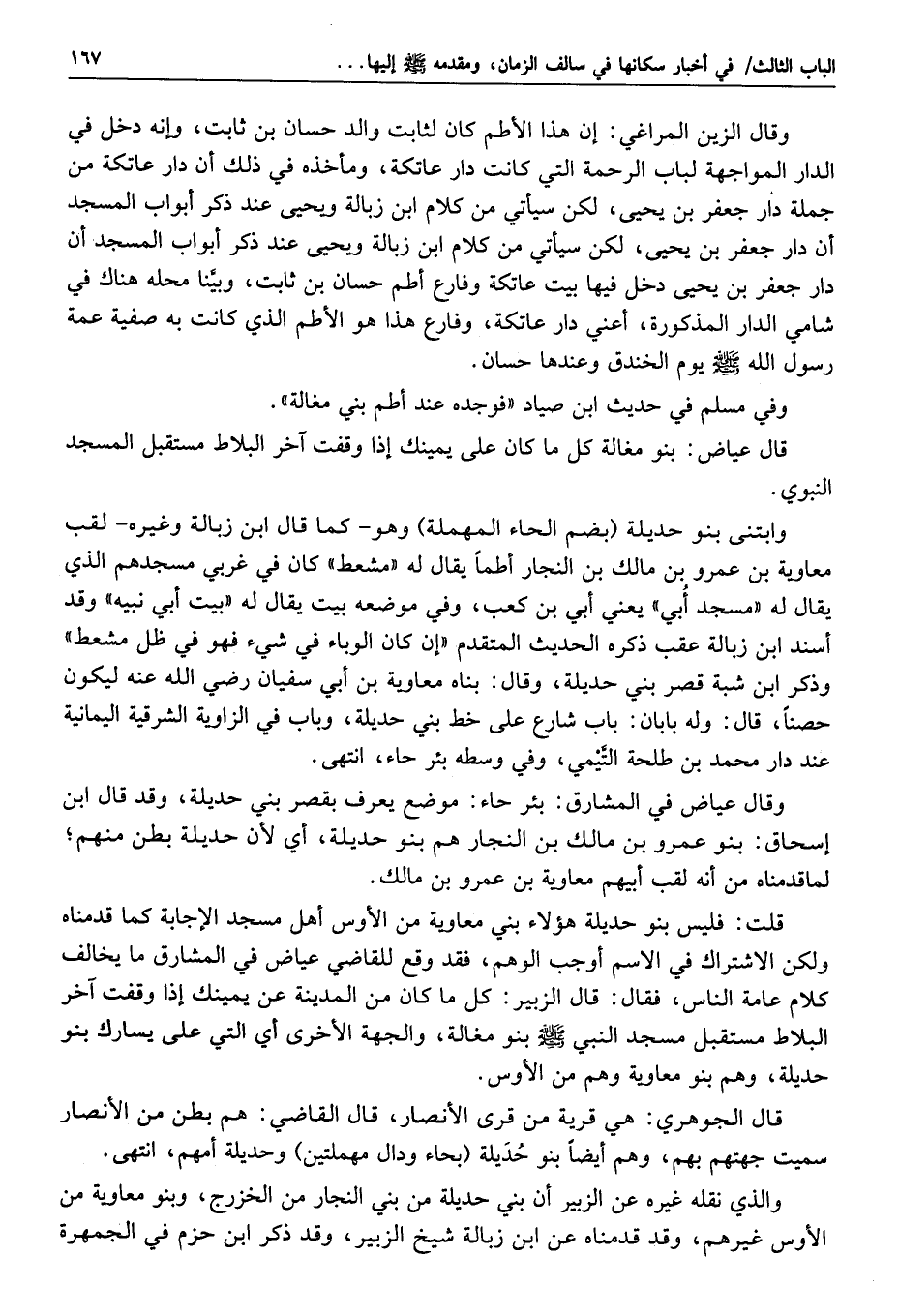 قلت: فهي مما يلي السوق، فإما أن يكون من جهة المشرق والمصلى حده من جهة المغرب، فيشهد ذلك لأنها الموضع المعروف اليوم بين أهل درب السويقة بسقيفة بني ساعدة، ويكون إطلاق السقيفة على ذلك المحل صحيحا، لا كما قال المطري: إنها بقرية ببني ساعدة عند بئر بضاعة؛ لأن سعد بن عبادة لم يكن هناك، وإنما كان مع رهطه في منزلهم، والسقيفة كانت عند منزله، وإما أن يكون جرار سعد مما يلي السوق من جهة