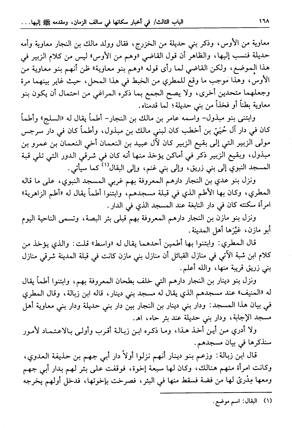 ونزلت بنو وقش وبنو عنان ابنا ثعلبة بن طريف بن الخزرج بن ساعدة الدار التي يقال لها «بنو ساعدة» ويقال لها أيضا «بنو طريف» وهي بين الحماضة وجرار سعد، وسيأتي في ترجمة الشوط ما يقتضي أن لبني ساعدة منزلا في شامي مسجد الراية، والظاهر أنه هذا المنزل، والله أعلم.