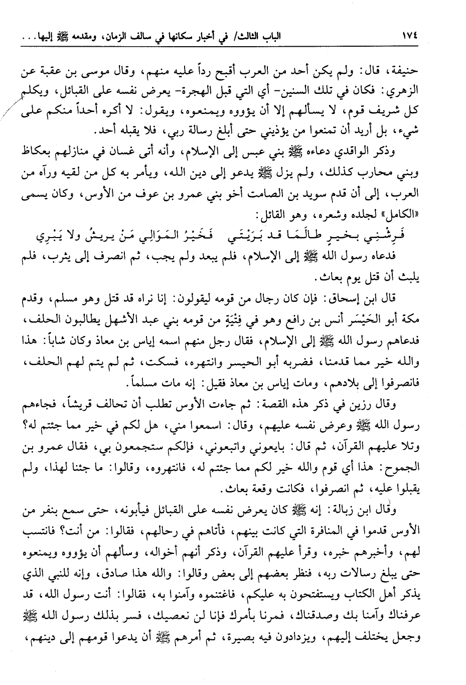 بأكثر، وهو اليوم الذي تقول فيه عائشة رضي الله عنها كما في الصحيح «كان يوم بعاث يوما قدمه الله لرسوله صلّى الله عليه وسلّم في دخولهم في الإسلام، فقدم رسول الله صلّى الله عليه وسلّم وقد افترق ملؤهم وقتلت سراتهم» يعني الأوس والخزرج، ومعناه أنه قتل فيه من أكابرهم من كان لا يؤمن أن يتكبر ويأنف أن يدخل في الإسلام لتصلبه في أمر الجاهلية ولشدة شكيمته حتى لا يكون تحت حكم غيره، وقد كان بقي منهم من هذا النمط عبد الله بن أبيّ بن سلول، وقصته في ذلك مشهورة، وكذلك أبو عامر الراهب الذي سماه النبي صلّى الله عليه وسلّم بالفاسق، قال أهل السير: قدم رسول الله صلّى الله عليه وسلّم المدينة وسيد أهلها عبد الله بن أبي بن سلول، كان من الخزرج ثم من بني عوف بن الخزرج ثم من بني الحبلى، لا يختلف في شرفه في قومه اثنان، لم تجتمع الأوس والخزرج قبله ولا بعده على رجل من أحد الفريقين حتى جاء الإسلام غيره، ومعه في الأوس رجل هو في قومه من الأوس شريف مطاع أبو عامر بن