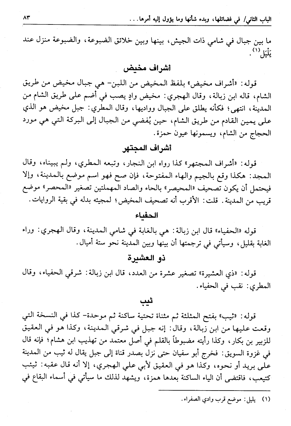 ورواه ابن النجار بلفظ: «حرّم رسول الله صلّى الله عليه وسلّم المدينة بريدا في بريد، وأرسلني فأعلمت على الحرم: على شرف ذات الجليس، وعلى مشيرب، وعلى أشراف المجتهر، وعلى تيم» ورواه ابن زبالة بهذا اللفظ، إلا أنه أسقط أشراف المجتهر، وأبدل تيم بثيب، وزاد «وعلى الحفياء وعلى ذي العشيرة» .