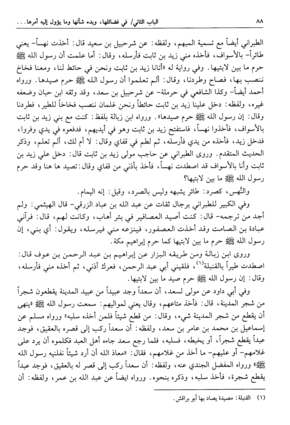 اعلم أن المفهوم من تحريم ذلك تشريف المدينة الشريفة وتعظيمها به لحلول أشرف المخلوقين صلوات الله وسلامه عليه، وانتشار أنواره وبركاته بأرضها، وكما أن الله تعالى جعل لبيته حرما تعظيما له جعل لحبيبه وأكرم الخلق عليه ما أحاط بمحله حرما تلتزم أحكامه، وتنال بركاته، ويوجد فيه من الخير والبركة والأنوار المنتشرة والسلامة العاجلة والآجلة ما لا يوجد في غيره، ولهذا حث النبي صلّى الله عليه وسلّم بني حارثة على الكون به، كما أشار إليه بقوله: «أراكم يا بني حارثة قد خرجتم من الحرم» ثم التفت فقال: «بل أنتم فيه» وذلك لخصوصية الكون فيه على الكون خارجه، وتخصيص ذلك المقدار إما أن يكون لما شاهده صلّى الله عليه وسلّم فيه من أمر رباني، وسر روحاني بثه الله فيه إلى تلك الحدود المتقدمة، وقد ذكر أهل الشهود أنهم يشاهدون الأنوار منبثة في الحرم وأهله إلى حدوده، ولها منابع تفيض عنها، وذلك في الحرمين جميعا، فترتبت الأحكام الظاهرة على تلك الحقائق الباطنة، ولهذا لما بلغت النار الآتي ذكرها طرف هذا الحرم الشريف طفئت كما سيأتي، وإما أن يكون بمقتضى أمر إلهي، ووحي رباني لا ندركه نحن؛ إذ العقول البشرية قاصرة عن إدراك معاني الأحكام المتلقاة عن النبوة، وإنما يظهر لها لايحه من شوارق مطالعها عند التأييد والتسديد، هدانا الله لإدراكها بمنه وكرمه.