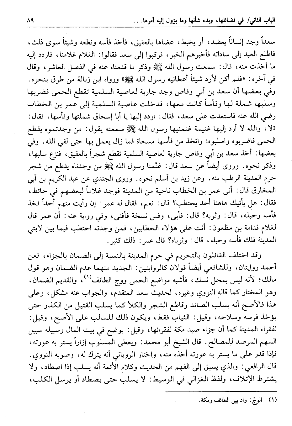 اتفق الشافعي ومالك وأحمد على تحريم صيد حرم المدينة، واصطياده، وقطع شجره. وقال أبو حنيفة: لا يحرم شيء من ذلك، والأحاديث الصحيحة الصريحة حجة عليه، وقد قدمنا جملة منها، ولو لم يكن إلا قوله صلّى الله عليه وسلّم «كما حرم إبراهيم مكة» لكان كفاية؛ فإنه يتمسك به في كل ما لم يقم دليل على افتراق الحرمين فيه. وروى أبو داود- وسكت عليه، قال النووي: وهو صحيح أو حسن، أي: كما هو قاعدته فيما يسكت عليه- أن سعد بن أبي وقاص رضي الله عنه أخذ رجلا يصيد في حرم المدينة الذي حرم رسول الله صلّى الله عليه وسلّم فسلبه ثيابه، فجاء مواليه فكلموه فيه، فقال: إن رسول الله صلّى الله عليه وسلّم «حرم هذا الحرم، وقال: من أخذ أحدا يصيد فيه فليسلبه فلا أرد عليكم طعمة أطعمنيها رسول الله صلّى الله عليه وسلّم ولكن إن شئتم دفعت إليكم ثمنه» وسيأتي عنه نحوه في قطع الشجر، وفي الموطأ عن أبي أيوب الأنصاري أنه وجد غلمانا قد ألجؤوا ثعلبا إلى زاوية، فطردهم عنه، قال مالك: