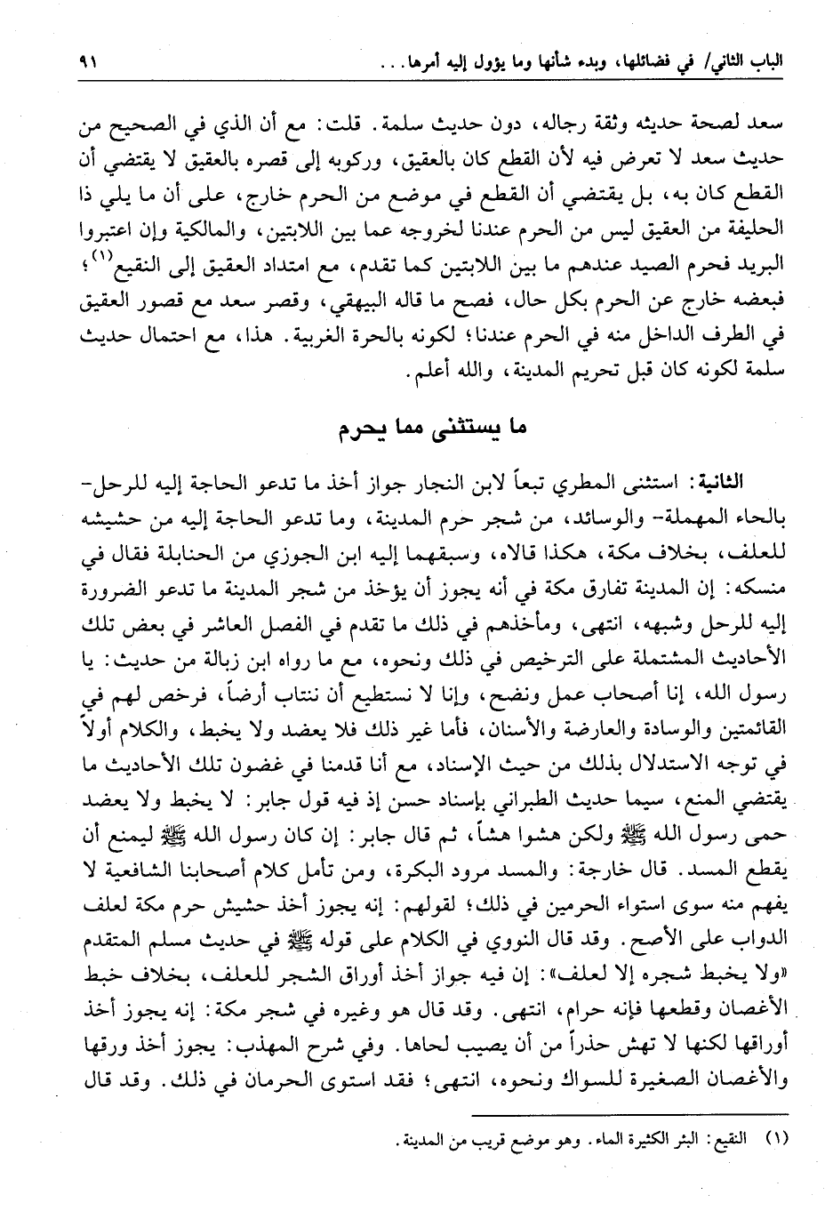 «لا، والله لا أرد إليها غنيمة غنمنيها رسول الله صلّى الله عليه وسلّم سمعته يقول: من وجدتموه يقطع الحمى فاضربوه واسلبوه» واتخذ من فأسها مسحاة فما زال يعمل بها حتى لقي الله. وفي بعضها: أخذ سعد بن أبي وقاص جارية لعاصية السلمية تقطع شجرا بالعقيق، فنزع سلبها، وذكر نحوه. وروى أيضا عن سعد قال: غنّمنا رسول الله صلى الله عليه وسلّم من وجدناه يقطع من شجر حرم المدينة الرطب منه. وعن زيد بن أسلم نحوه. وروى الجندي عن عبد الكريم بن أبي المخارق قال: أتى عمر بن الخطاب ناحية من المدينة فوجد غلاما لبعضهم في حائط، فقال: هل يأتيك هاهنا أحد يحتطب؟ قال: نعم، فقال له عمر: إن رأيت منهم أحدا فخذ فأسه وحبله، قال: وثوبه؟ قال: فأبى، وفس نسخة فأفتى، وفي رواية عنه: أن عمر قال لغلام قدامة بن مظعون: أنت على هؤلاء الحطابين، فمن وجدته احتطب فيما بين لابتي المدينة فلك فأسه وحبله، قال: وثوباه؟ قال عمر: ذلك كثير.