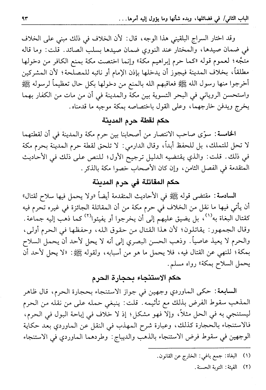 استثنى المطري تبعا لابن النجار جواز أخذ ما تدعو الحاجة إليه للرحل- بالحاء المهملة- والوسائد، من شجر حرم المدينة، وما تدعو الحاجة إليه من حشيشه للعلف، بخلاف مكة، هكذا قالاه، وسبقهما إليه ابن الجوزي من الحنابلة فقال في منسكه: إن المدينة تفارق مكة في أنه يجوز أن يؤخذ من شجر المدينة ما تدعو الضرورة إليه للرحل وشبهه، انتهى، ومأخذهم في ذلك ما تقدم في الفصل العاشر في بعض تلك الأحاديث المشتملة على الترخيص في ذلك ونحوه، مع ما رواه ابن زبالة من حديث: يا رسول الله، إنا أصحاب عمل ونضح، وإنا لا نستطيع أن ننتاب أرضا، فرخص لهم في القائمتين والوسادة والعارضة والأسنان، فأما غير ذلك فلا يعضد ولا يخبط، والكلام أولا في توجه الاستدلال بذلك من حيث الإسناد، مع أنا قدمنا في غضون تلك الأحاديث ما يقتضي المنع، سيما حديث الطبراني بإسناد حسن إذ فيه قول جابر: لا يخبط ولا يعضد حمى رسول الله صلّى الله عليه وسلّم ولكن هشوا هشا، ثم قال جابر: إن كان رسول الله صلّى الله عليه وسلّم ليمنع أن يقطع المسد. قال خارجة: والمسد مرود البكرة، ومن تأمل كلام أصحابنا الشافعية لا يفهم منه سوى استواء الحرمين في ذلك؛ لقولهم: إنه يجوز أخذ حشيش حرم مكة لعلف الدواب على الأصح. وقد قال النووي في الكلام على قوله صلّى الله عليه وسلّم في حديث مسلم المتقدم «ولا يخبط شجره إلا لعلف» : إن فيه جواز أخذ أوراق الشجر للعلف، بخلاف خبط الأغصان وقطعها فإنه حرام، انتهى. وقد قال هو وغيره في شجر مكة: إنه يجوز أخذ أوراقها لكنها لا تهش حذرا من أن يصيب لحاها. وفي شرح المهذب: يجوز أخذ ورقها والأغصان الصغيرة للسواك ونحوه، انتهى؛ فقد استوى الحرمان في ذلك. وقد قال