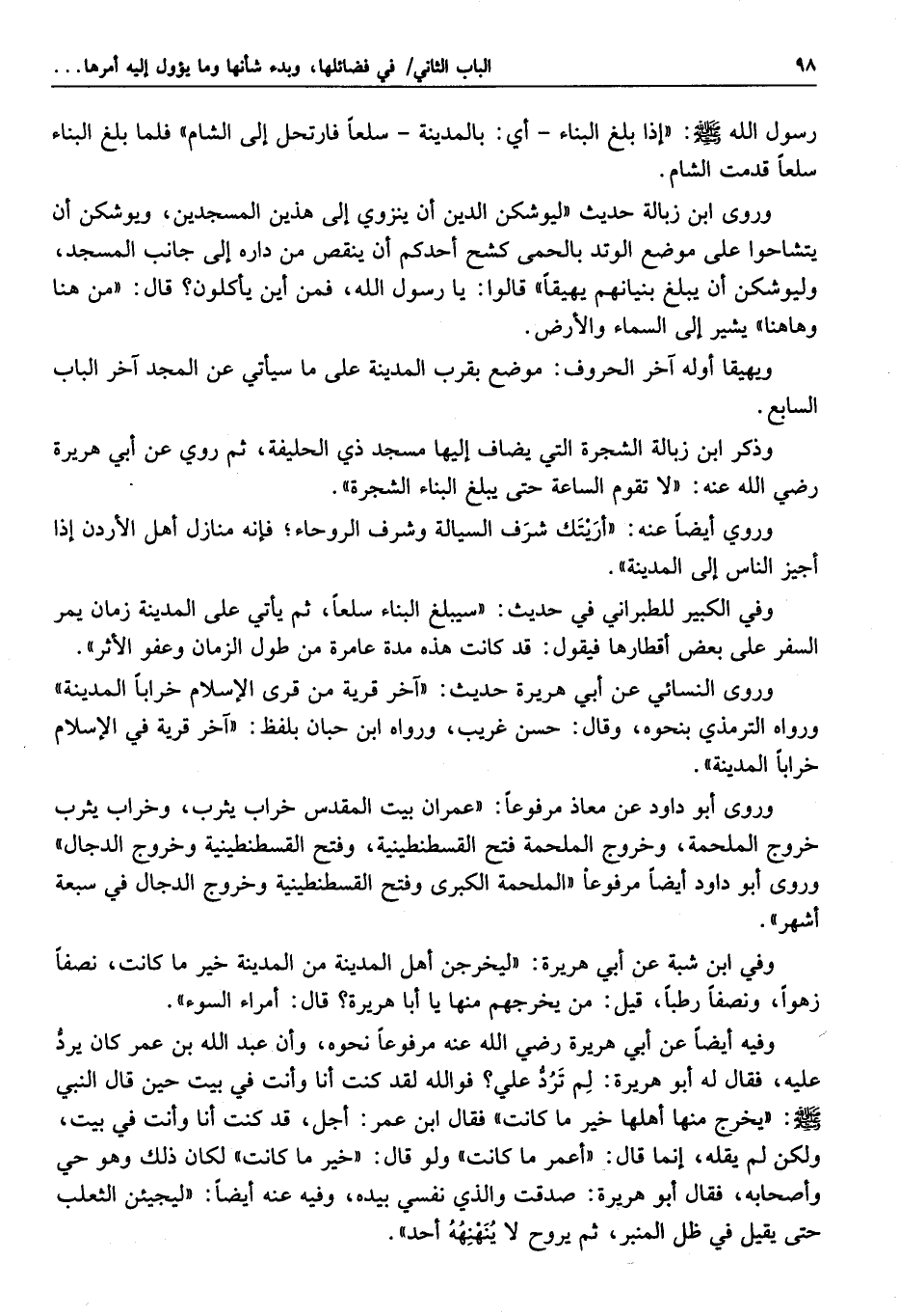 وروينا في الكبير للطبراني أن النبي صلّى الله عليه وسلّم قال: «إن الله عز وجل اطلع إلى أهل المدينة وهي بطحاء قبل أن تعمر ليس فيها مدر ولا بشر، فقال: يا أهل يثرب، إني مشترط عليكم ثلاثا وسائق إليكم من كل الثمرات: لا تعصي، ولا تعلي، ولا تكبّري، فإن فعلت شيئا من ذلك تركتك كالجزور لا يمنع من أكله.