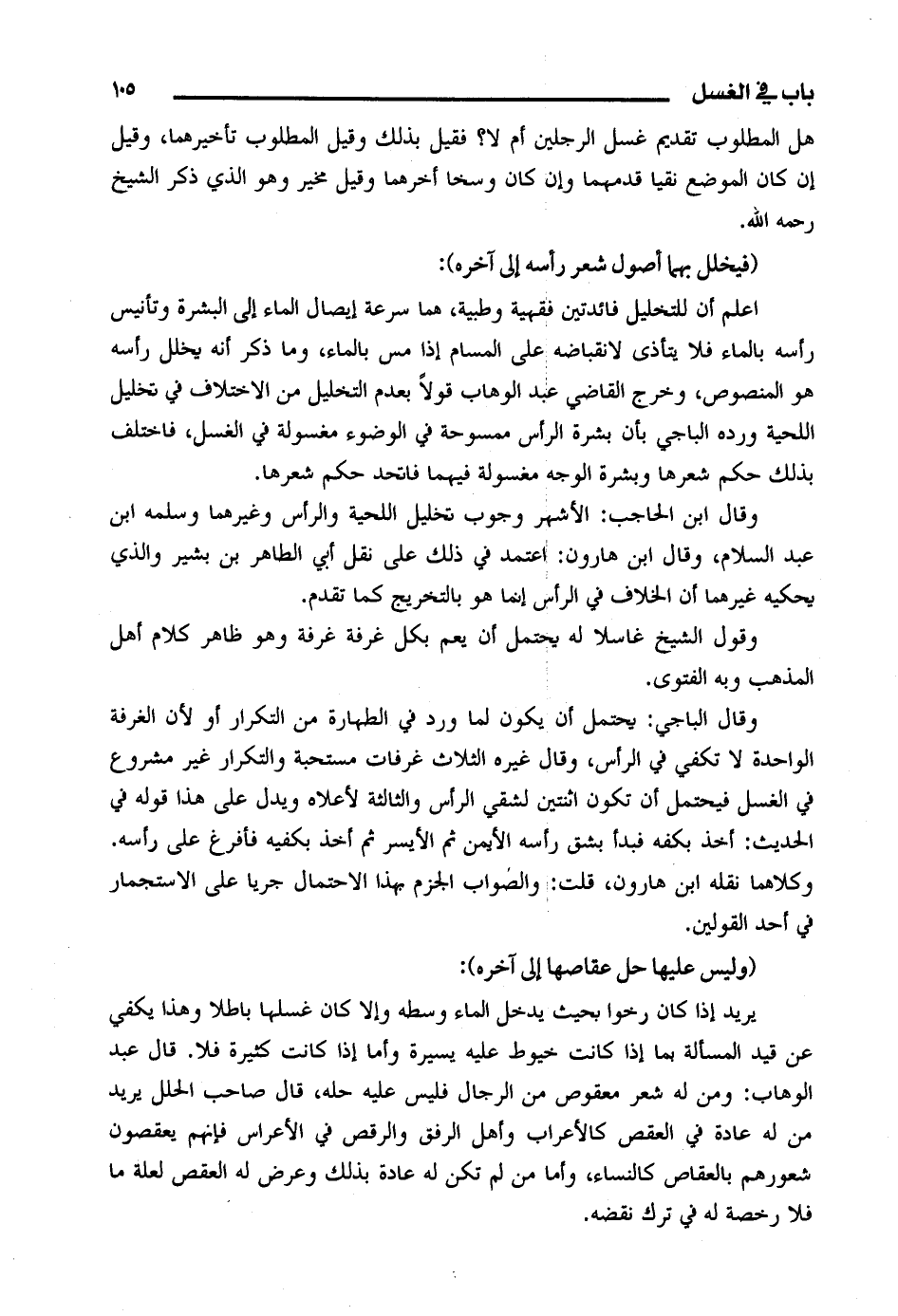 وقال ابن الحاجب: الأشهر وجوب تخليل اللحية والرأس وغيرهما وسلمه ابن عبدالسلام، وقال ابن هارون: اعتمد في ذلك على نقل أبي الطاهر بن بشير والذي يحكيه غيرهما أن الخلاف في الرأس إنما هو بالتخريج كما تقدم.