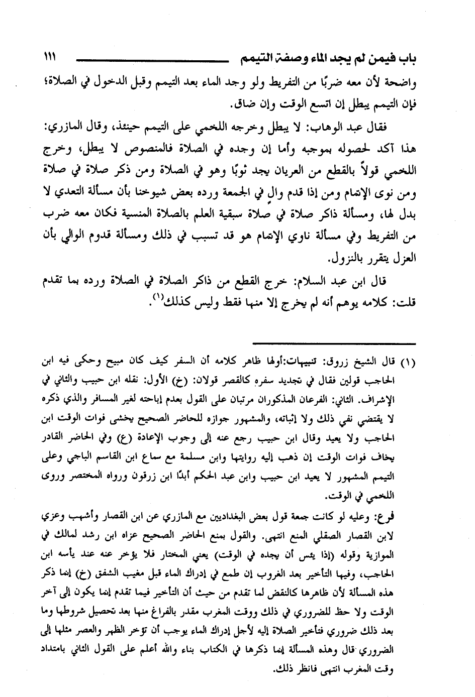 فقال عبد الوهاب: لا يبطل وخرجه اللخمي على التيمم حينئذ، وقال المازري: هذا آكد لحصوله بموجبه وأما إن وجده في الصلاة فالمنصوص لا يبطل، وخرج اللخمي قولا بالقطع من العريان يجد ثوبا وهو في الصلاة ومن ذكر صلاة من صلاة ومن نوي الإتمام ومن إذا قدم وال في الجمعة ورده بعض شيوخنا بأن مسألة التعدي لا بدل لها، ومسألة ذاكر صلاة في صلاة سبقية العلم بالصلاة المنسية فكان معه ضرب من التفريط وفي مسألة ناوي الإتمام هو قد تسبب في ذلك ومسألة قدوم الوالي بأن العزل يتقرر بالنزول.