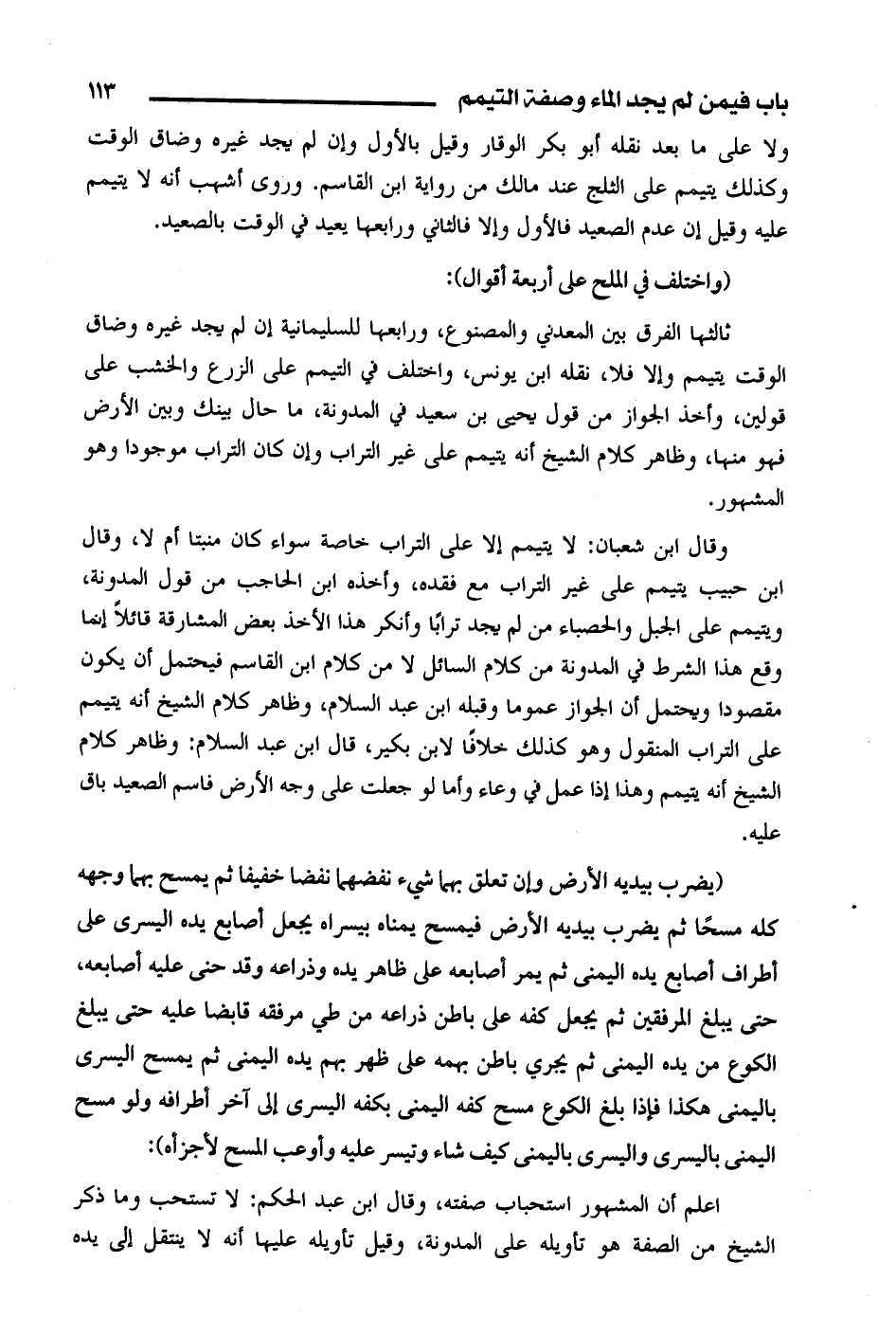 ثالثها الفرق بين المعدني والمصنوع، ورابعها للسليمانية إن لم يجد غيره وضاق الوقت يتيمم وإلا فلا، نقله ابن يونس، واختلف في التيمم على الزرع والخشب على قولين، وأخذ الجواز من قول يحيى بن سعيد في المدونة، ما حال بينك وبين الأرض فهو منها، وظاهر كلام الشيخ أنه يتيمم على غير التراب وإن كان التراب موجودا وهو المشهور.