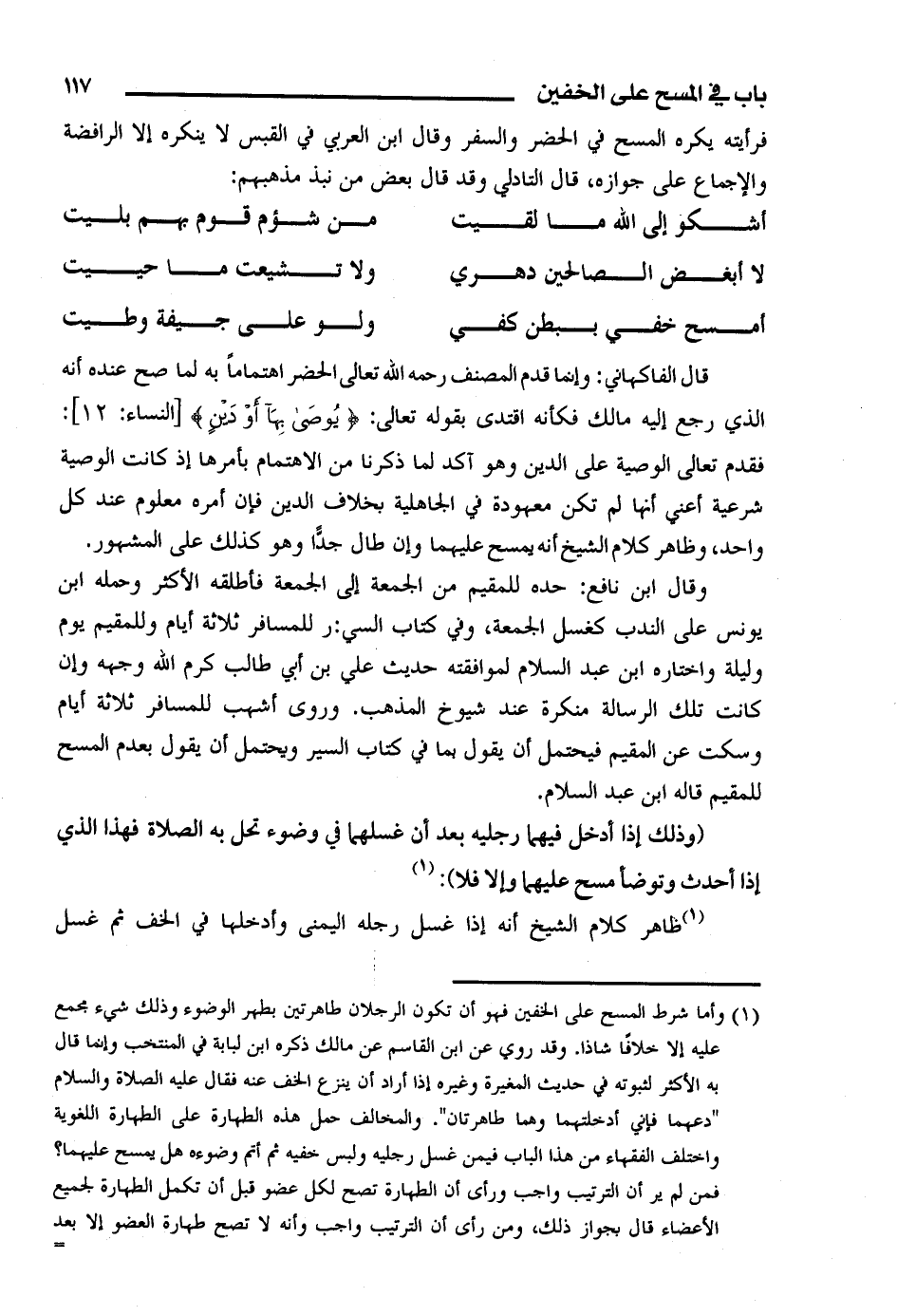 فرأيته يكره المسح في الحضر والسفر وقال ابن العربي في القبس لا ينكره إلا الرافضة والإجماع على جوازه، قال التادلي وقد قال بعض من نبذ مذهبهم: