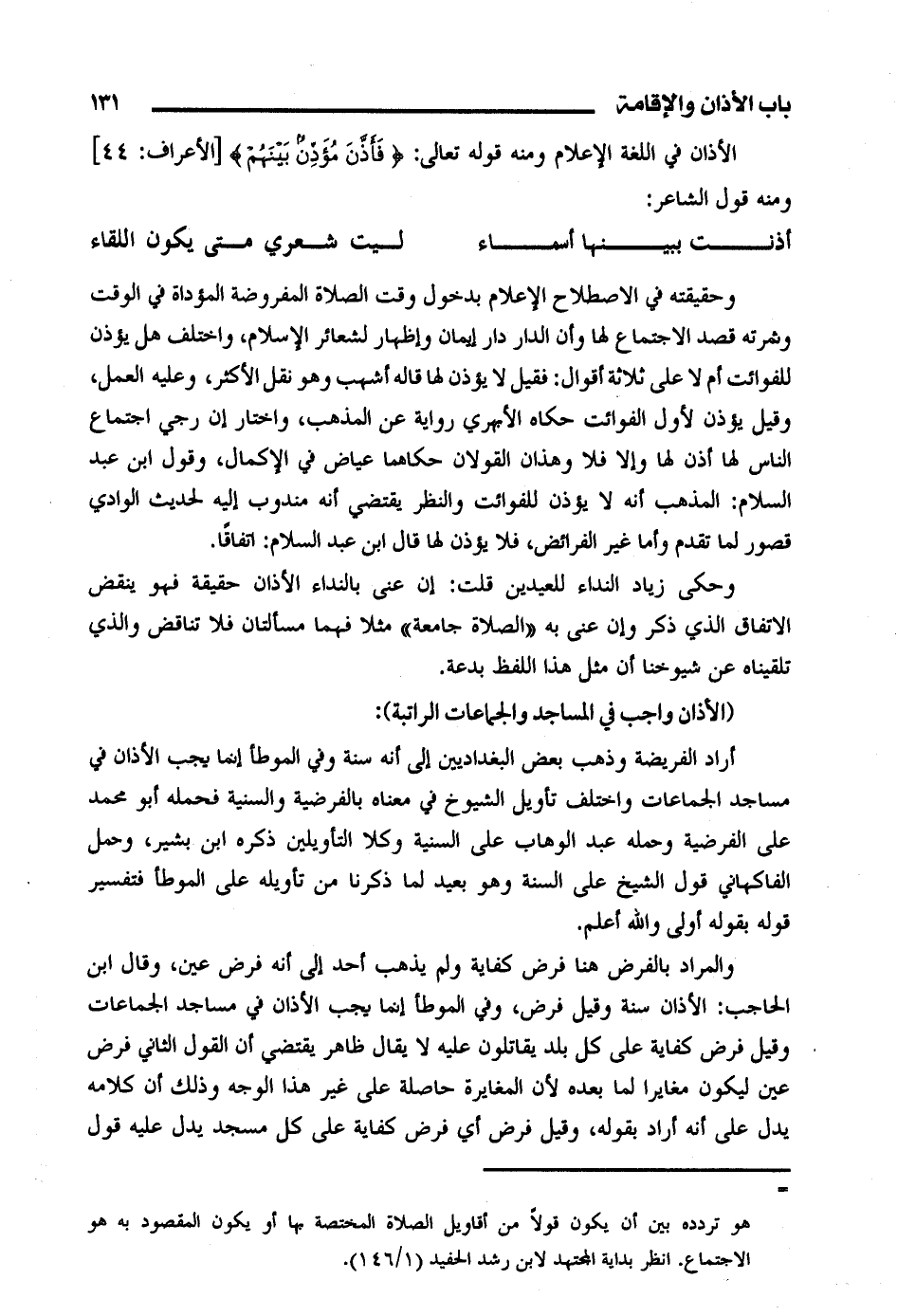 أراد الفريضة وذهب بعض البغداديين إلى أنه سنة وفي الموطأ إنما يجب الأذان في مساجد الجماعات واختلف تأويل الشيوخ في معناه بالفرضية والسنية فحمله أبو محمد على الفرضية وحمله عبد الوهاب على السنية وكلا التأويلين ذكره ابن بشير، وحمل الفاكهاني قول الشيخ على السنة وهو بعيد لما ذكرنا من تأويله على الموطأ فتفسير قوله بقوله أولى والله أعلم.