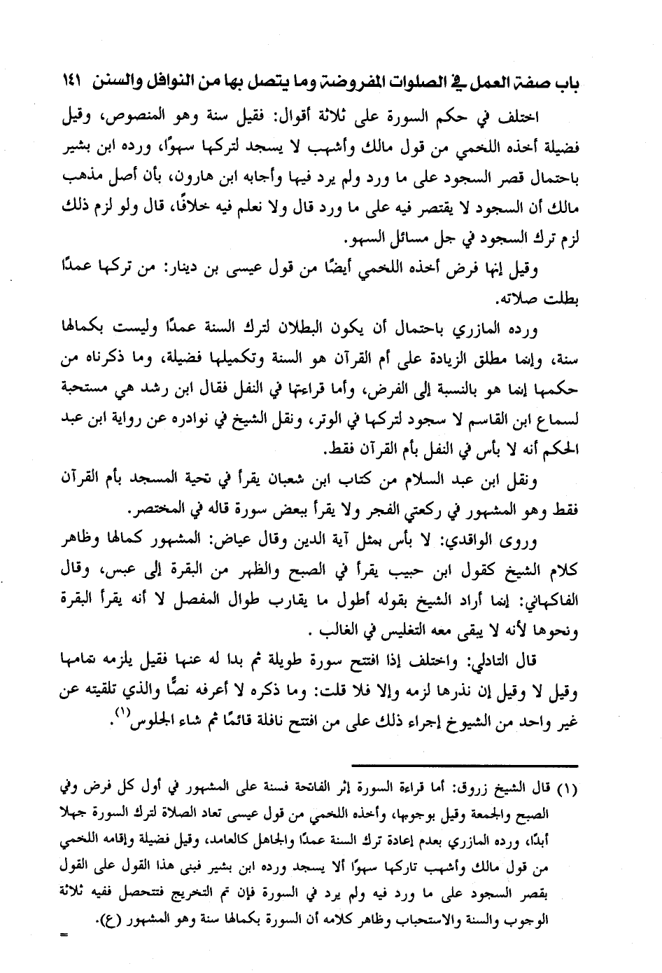ورده المازري باحتمال أن يكون البطلان لترك السنة عمدا وليست بكمالها سنة، وإنما مطلق الزيادة على أم القرآن هو السنة وتكميلها فضيلة، وما ذكرناه من حكمها إنما هو بالنسبة إلى الفرض، وأما قراءتها في النفل فقال ابن رشد هي مستحبة لسماع ابن القاسم لا سجود لتركها في الوتر، ونقل الشيخ في نوادره عن رواية ابن عبد الحكم أنه لا بأس في النفل بأم القرآن فقط.