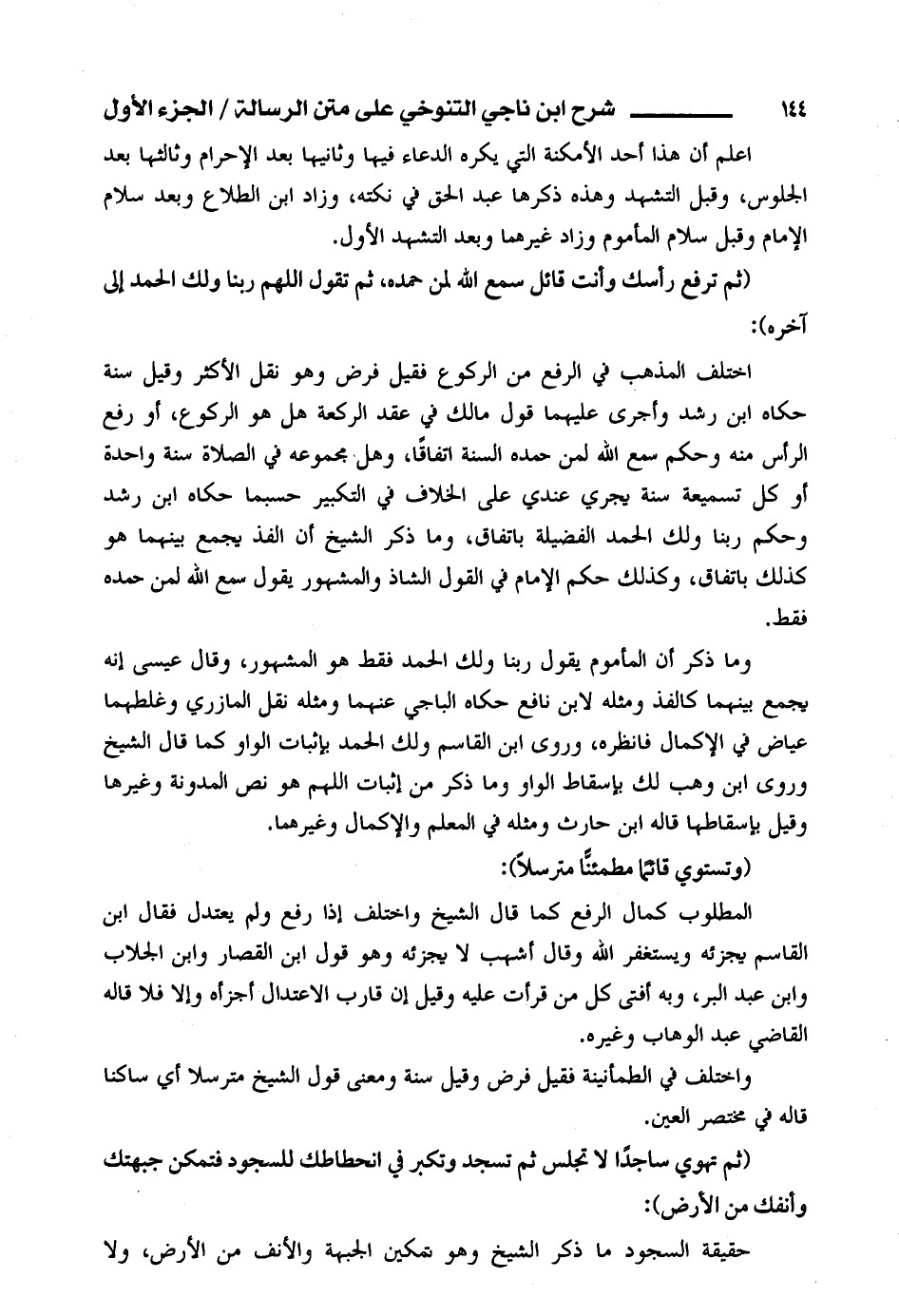 اختلف المذهب في الرفع من الركوع فقيل فرض وهو نقل الأكثر وقيل سنة حكاه ابن رشد وأ جرى عليهما قول مالك في عقد الركعة هل هو الركوع، أو رفع الرأس منه وحكم سمع الله لمن حمده السنة اتفاقا، وهل مجموعة في الصلاة سنة واحدة أو كل تسميعة سنة يجري عندي على الخلاف في التكبير حسبما حكاه ابن رشد وحكم ربنا ولك الحمد الفضيلة باتفاق، وما ذكر الشيخ أن الفذ يجمع بينهما هو كذلك باتفاق، وكذلك حكم الإمام في القول الشاذ والمشهور يقول سمع الله لمن حمده فقط.