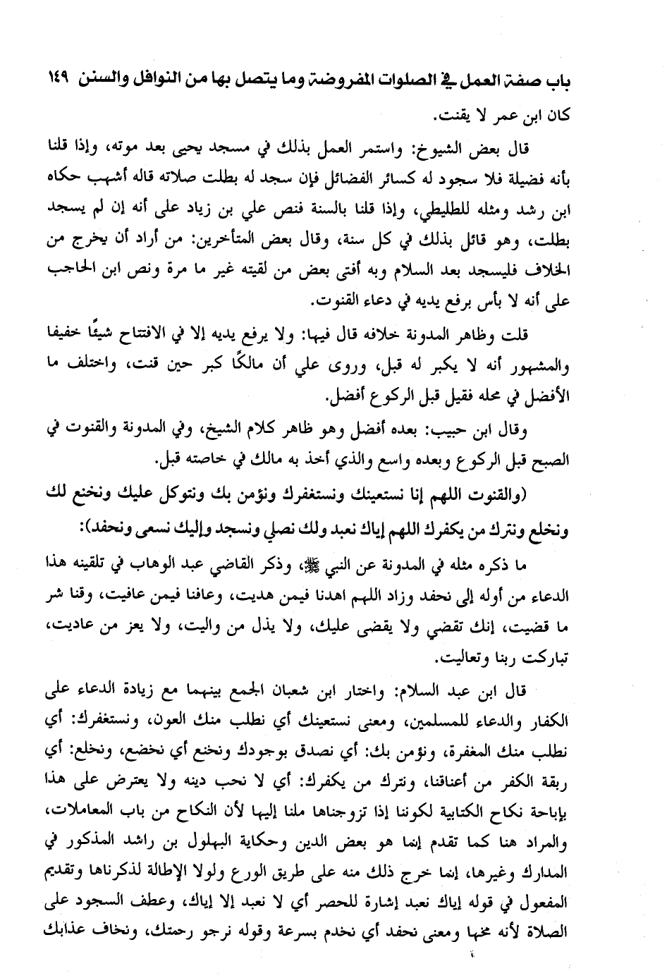 قال ابن عبد السلام: واختار ابن شعبان الجمع بينهما مع زيادة الدعاء على الكفار والدعاء للمسلمين، ومعنى نستعينك أي نطلب منك العون، ونستغفرك: أي نطلب منك المغفرة، ونؤمن بك: أي نصدق بوجودك ونخنع أي نخضع، ونخلع: أي ربقة الكفر من أعناقنا، ونترك من يكفرك: أي لا نحب دينه ولا يعترض على هذا بإباحة نكاح الكتابية لكوننا إذا تزوجناها ملنا إليها لأن النكاح في باب المعاملات، والمراد هنا كما تقدم إنما هو بعض الدين وحكاية البهلول بن راشد المذكور في المدارك وغيرها، إنما خرج ذلك منه على طريق الورع ولولا الإطالة لذكرناها وتقديم المفعول في قوله إياك نعبد إشارة للحصر أي لا نعبد إلا إياك، وعطف السجود على الصلاة لأنه مخها ومعنى نحفد أي نخدم بسرعة وقوله نرجو رحمتك، ونخاف عذابك