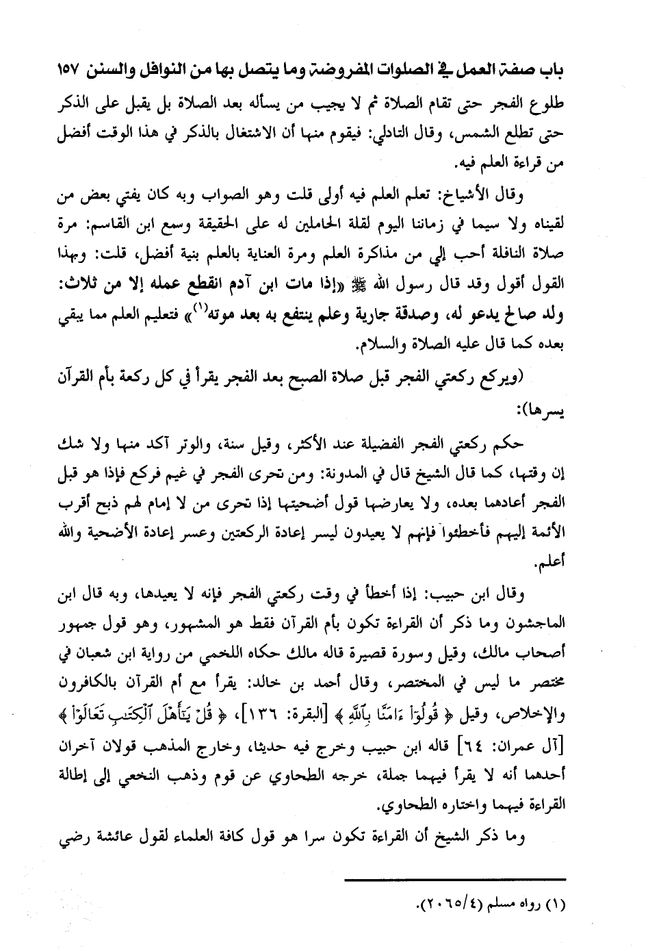وقال الأشياخ: تعلم العلم فيه أولى قلت وهو الصواب وبه كان يفتي بعض من لقيناه ولا سيما في زماننا اليوم لقلة الحاملين له على الحقيقة وسمع ابن القاسم: مرة صلاة النافلة أحب إلي من مذاكرة العلم ومرة العناية بالعلم بنية أفضل، قلت: وبهذا القول أقول وقد قال رسول الله صلى الله عليه وسلم "إذا مات ابن آدم انقطع عمله إلا من ثلاث: ولد صالح يدعو له، وصدقة جارية وعلم ينتفع به بعد موته" فتعليم العلم مما يبقي بعده كما قال عليه الصلاة والسلام.