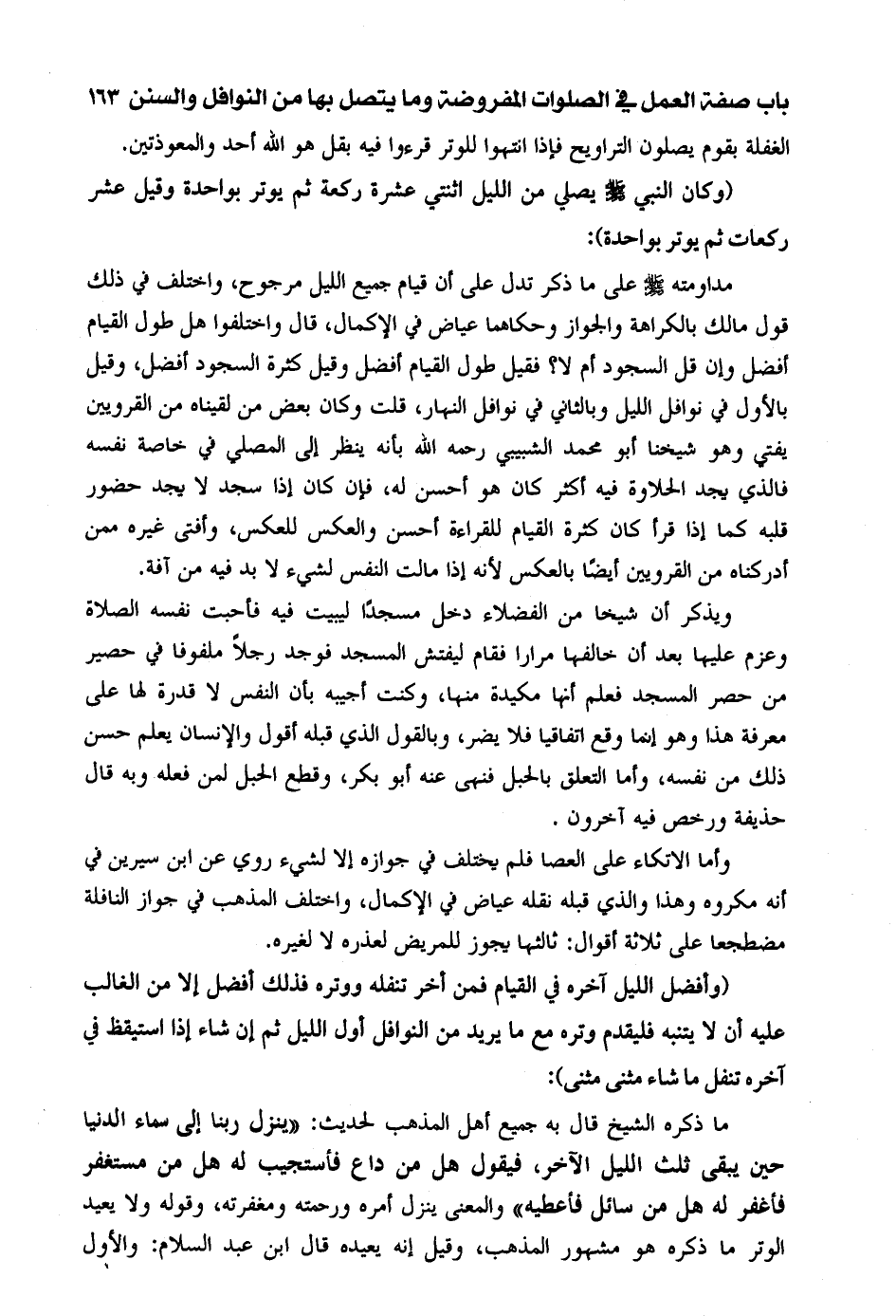 مداومته صلى الله عليه وسلم على ما ذكر تدل على أن قيام جميع الليل مرجوح، واختلف في ذلك قول مالك بالكراهة والجواز وحكاهما عياض في الإكمال، قال واختلفلوا هل طول القيام أفضل وإن قل السجود أم لا؟ فقيل طول القيام أفضل وقيل كثرة السجود أفضل، وقيل بالأول في نوافل الليل وبالثاني في نوافل النهار، قلت وكان بعض من لقيناه من القرويين يفتي وهو شيخنا أبو محمد الشبيبي رحمه الله بأنه ينظر إلى المصلي في خاصة نفسه فالذي يجد الحلاوة فيه أكثر القيام للقراءة أحسن والعكس للعكس، وأفتى غيره ممن أدركناه من القرويين أيضًا بالعكس لأنه إذا مالت النفس لشيء لابد فيه من آفة.