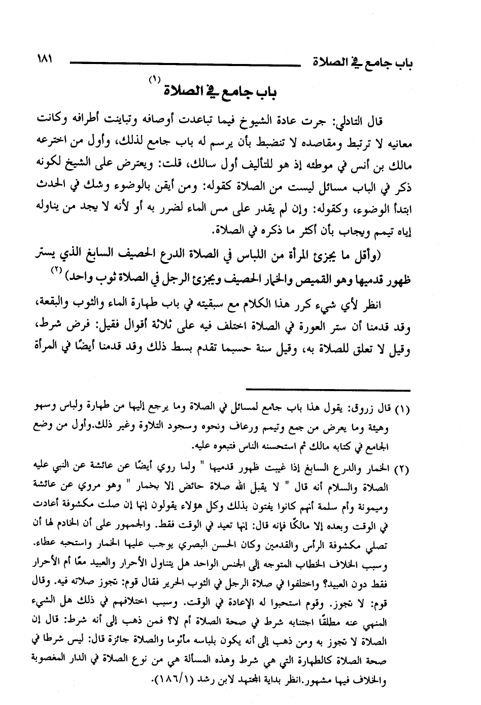 قال التادلي: جرت عادة الشيوخ فيما تباعدت أوصافه وتباينت أطرافه وكانت معانيه لا ترتبط ومقاصده لا تنضبط بأن يرسم له باب جامع لذلك، وأول من اخترعه مالك بن أنس في موطئه إذ هو للتأليف أول سالك، قلت: ويعترض على الشيخ لكونه ذكر في الباب مسائل ليست من الصلاة كقوله: ومن أيقن بالوضوء وشك في الحدث ابتدأ الوضوء، وكقوله: وإن لم يقدر على مس الماء لضرر به أو لأنه لا يجد من يناوله إياه تيمم ويجاب بأن أكثر ما ذكره في الصلاة.