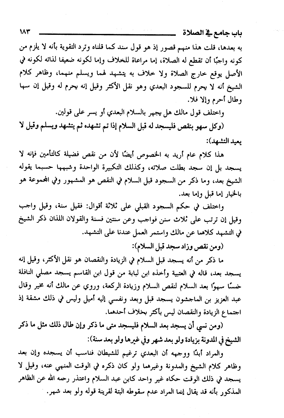 (ومن نسي أن يسجد بعد السلام فليسجد متى ما ذكر وإن طال ذلك مثل ما ذكر الشيخ في المدونة بزيادة ولو بعد شهر وفي غيرها ولو بعد سنة):