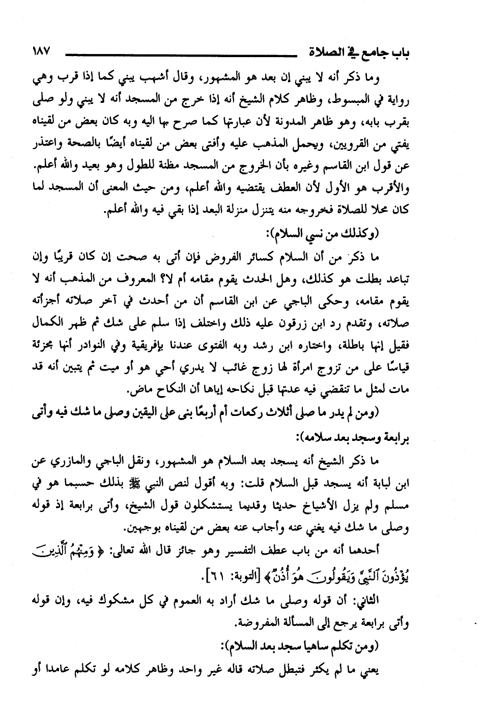 ما ذكر من أن السلام كسائر الفروض فإن أتى به صحت إن كان قريبا وإن تباعد بطلت هو كذلك، وهل الحدث يقوم مقامه أم لا؟ المعروف من المذهب أنه لا يقوم مقامه، وحكى الباجي عن ابن القاسم أن من أحدث في آخر صلاته أجزأته صلاته، وتقدم رد ابن زرقون على ذلك واختلف إذا سلم على شك ثم ظهر الكمال فقيل إنها باطلة، واختاره ابن رشد وبه الفتوى عندنا وبإفريقية وفي النوادر أنها مجزئة قياسا على من تزوج امرأة لها زوج غائب لا يدري أحي هو أو ميت ثم يتبين أنه قد مات لمثل ما تنقضي فيه عدتها قبل نكاحه إياها أن النكاح ماض.
