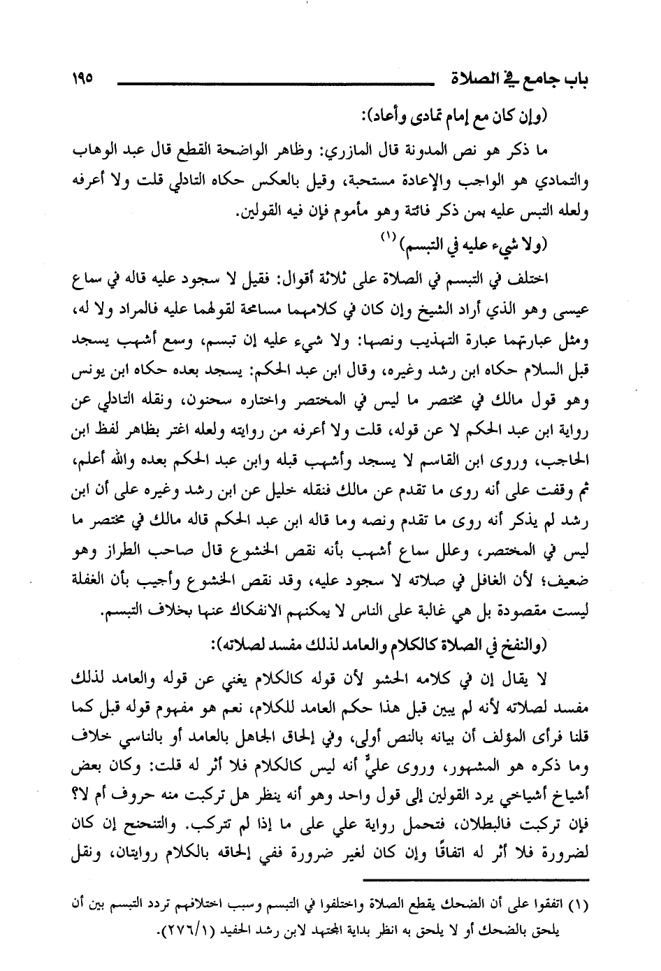 اختلف في التبسم في الصلاة على ثلاثة أقوال: فقيل لا سجود عليه قاله في سماع عيسى وهو الذي أراد الشيخ وإن كان في كلامهما مسامحة لقولهما عليه فالمراد ولا له، ومثل عبارتهما عبارة التهذيب ونصها: ولا شيء عليه إن تبسم، وسمع أشهب يسجد قبل السلام حكاه ابن رشد وغيره، وقال ابن عبد الحكم: يسجد بعده حكاه ابن يونس وهو قول مالك في مختصر ما ليس في المختصر واختاره سحنون، ونقله التادلي عن رو اية ابن عبد الحكم لا عن قوله، قلت ولا أعرفه من روايته ولعله اغتر بظاهر لفظ ابن الحاجب، وروى ابن القاسم لا يسجد وأشهب قبله وابن عبدالحكم بعده والله أعلم، ثم وقفت على أنه روى ما تقدم عن مالك فنقله خليل عن ابن رشد وغيره على أن ابن رشد لم يذكر أنه روى ما تقدم ونصه وما قاله ابن عبدالحكم قاله مالك في مختصر ما ليس في المختصر، وعلل سماع أشهب بأنه نقص الخشوع قال صاحب الطراز وهو ضعيف؛ لأن الغافل في صلاته لا سجود عليه، وقد نقص الخشوع وأجيب بأن الغفلة ليست مقصودة بل هي غالبة على الناس لا يمكنهم الانفكاك عنها بخلاف التبسم.