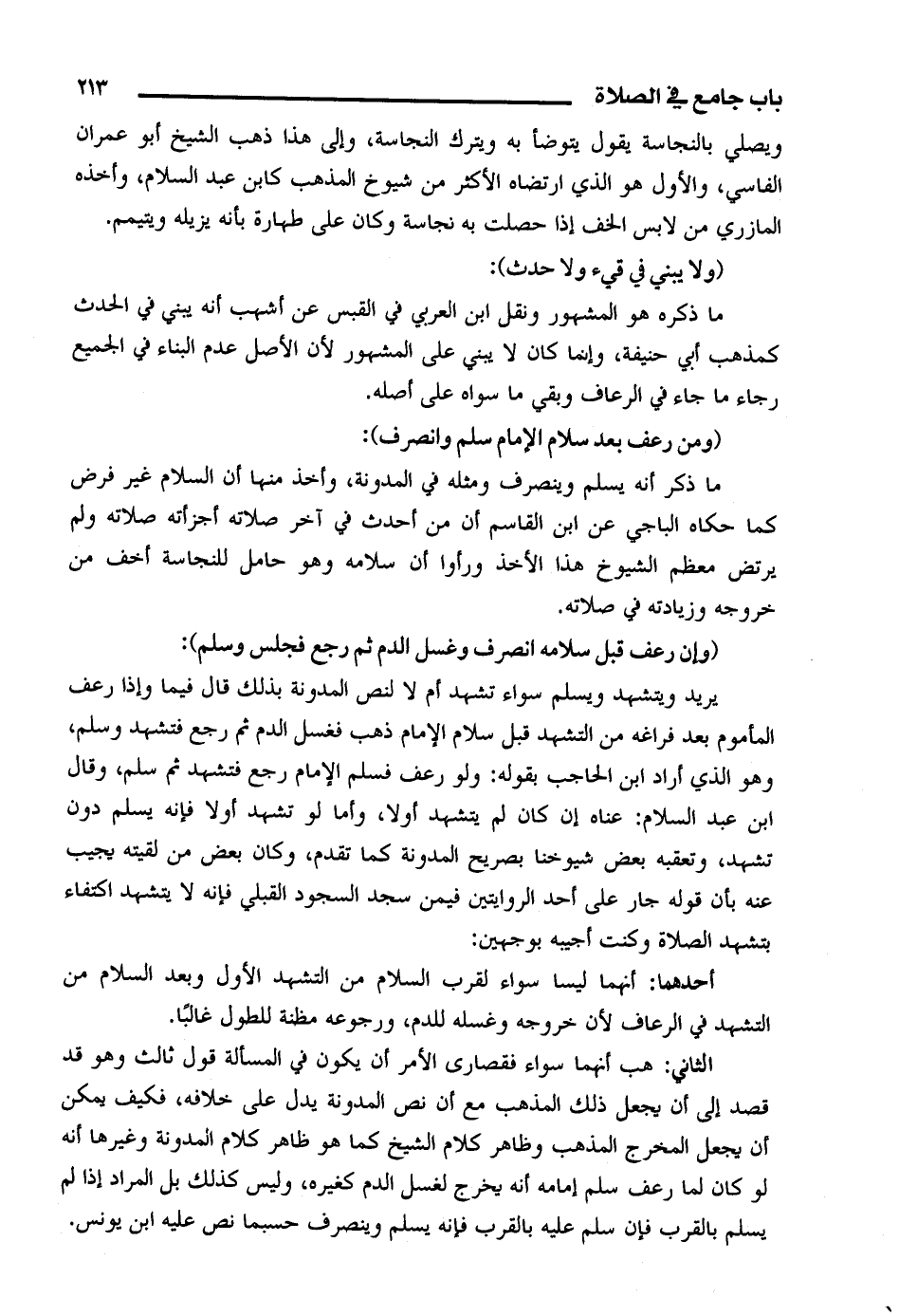ويصلي بالنجاسة يقول يتوضأ به ويترك النجاسة، وإلى هذا ذهب الشيخ أبو عمران الفاسي، والأول هو الذي ارتضاه الأكثر من شيوخ المذهب كابن عبد السلام، وأخذه المازري من لابس الخف إذا حصلت به نجاسة وكان على طهارة بأنه يزيله ويتيمم.