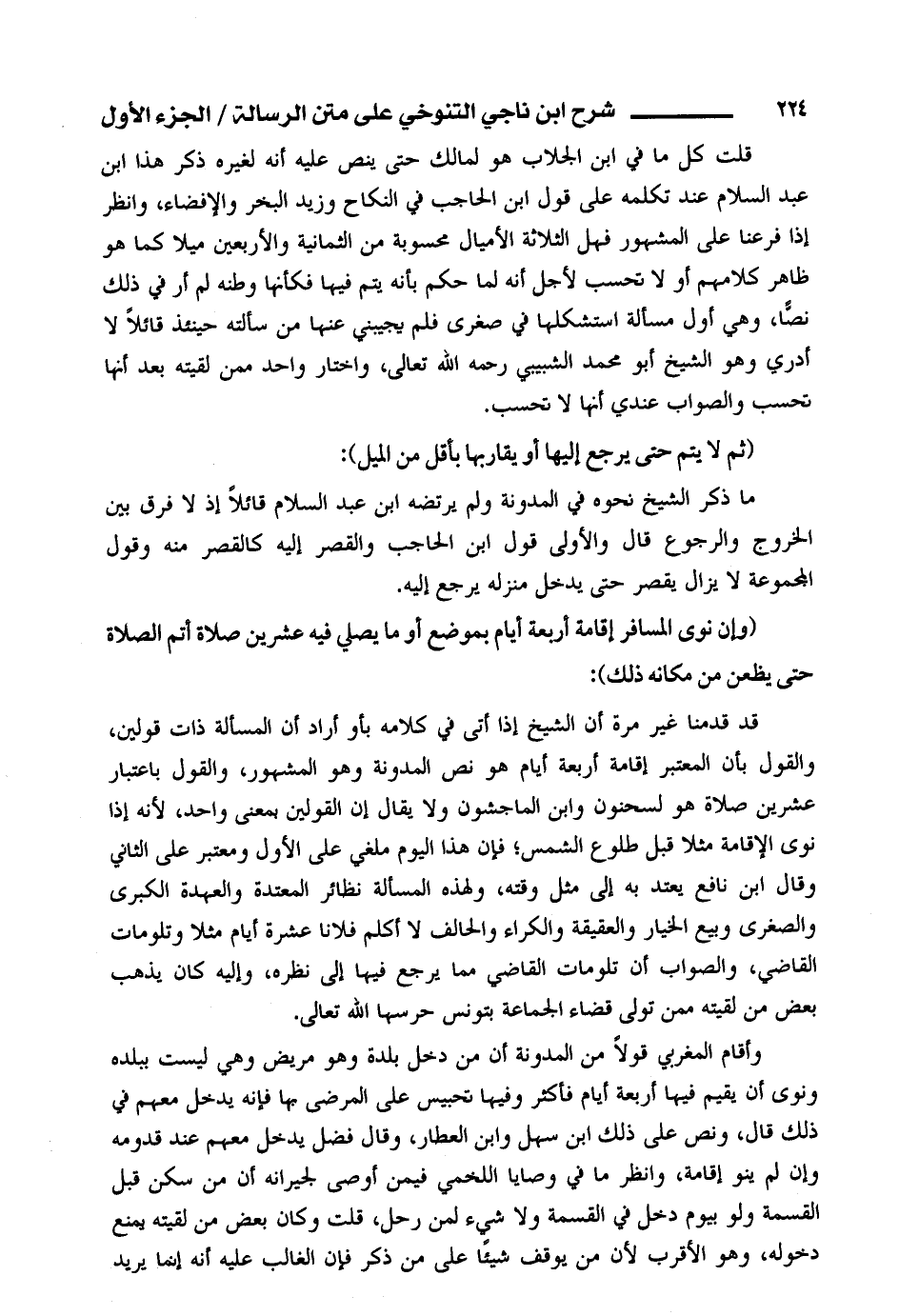 قلت كل ما في ابن الجلاب هو لمالك حتى ينص عليه أنه لغيره ذكر هذا ابن عبد السلام عند تكلمه على قول ابن الحاجب في النكاح وزيد البخر والإفضاء، وانظر إذا فرعنا على المشهور فهل الثلاثة الأميال محسوبة من الثمانية والأربعين ميلا كما هو ظاهر كلامهم أو لا تحسب لأجل أنه لما حكم بأنه يتم فيها فكأنها وطنه لم أر في ذلك نصا، وهي أول مسألة استشكلها في صغرى فلم يجيبني عنه من سألته حينئذ قائلا لا أدري وهو الشيخ أبو محمد الشبيبي رحمه الله تعالى، واختار واحد ممن لقيته بعد أنها تحسب والصواب عندي أنها لا تحسب.