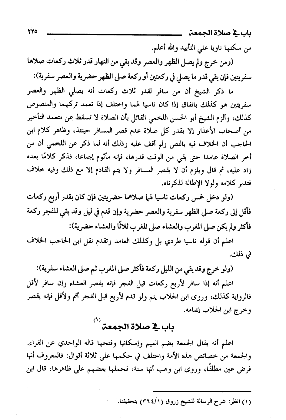 ما ذكر الشيخ أنه من سافر لقدر ثلاث ركعات أنه يصلي الظهر والعصر سفريتين هو كذلك باتفاق إذا كان ناسيا ولهما واختلف إذا تعمد تركهما والمنصوص كذلك، وألزم الشيخ أبو الحسن اللخمي القائل بأن الصلاة لا تسقط عن متعمد التأخير من أصحاب الأعذار إلا بقدر كل صلاة عدم قصر المسافر حينئذن وظاهر كلام ابن الحاجب أن الخلاف فيه بالنص ولم أقف عليه وذلك أنه لما ذكر عن اللخمي أن من أخر الصلاة عمدا حتى بقي من الوقت قدرها، فإنه مأثوم إجماعا، فذكر كلاما بعده زاد عليه، ثم قال ويلزم أن لا يقصر المسافر ولا يتم القادم إلا مع ذلك وفيه خلاف فتدبر كلامه ولولا الإطلالة لذكرناه.