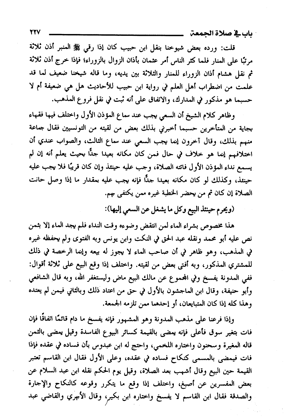 هذا مخصوص بشراء الماء لمن انتقض وضوءه وقت النداء فلم يجد الماء إلا بثمن نص عليه أبو محمد ونقله عبد الحق في النكت وابن يونس وبه الفتوى ولم يحفظه غيره في المذهب، وهو ظاهر في أن صاحب الماء لا يجوز له بيعه وإنما الرخصة في ذلك للمشتري المذكور، وبه أفتى بعض من لقيته. واختلف إذا وقع البيع على ثلاثة أقوال: ففي المدونة يفسخ وفي المجموع عن مالك البيع ماض وليستغفر الله، وبه قال الشافعي وأبو حنيفة، وقال ابن الماجشون بالأول في حق من اعتاد ذلك وبالثاني فيمن لم يعتده وهذا كله إذا كان المتبايعان، أو إحدهما ممن تلزمه الجمعة.