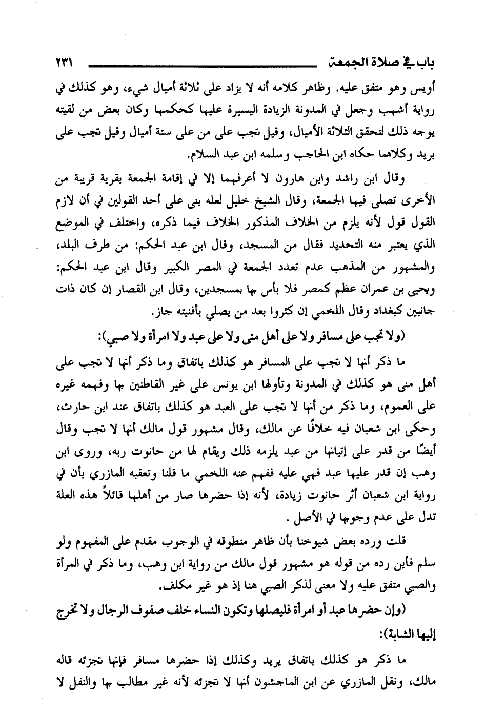 وقال ابن راشد وابن هارون ولا أعرفهما إلا في إقامة الجمعة بقرية قريبة من الأخرى تصلي فيها الجمعة، وقال الشيخ خليل لعله بنى على أحد القولين في أن لازم القول قول لأنه يلزم من الخلاف المذكور الخلاف فيما ذكره، واختلف في الموضع الذي يعتبر منه التحديد فقال من المسجد، وقال ابن عبد الحكم: من طرف البلد، والمشهور من المذهب عدم تعدد الجمعة في المصر الكبير وقال ابن عبد الحكم: ويحيى بن عمران عظم كمصر فلا بأس بها بمسجدين، وقال ابن القصار إن كان ذات جانبين كبغداد وقال اللخمي إن كثروا بعد من يصلي بأفنيته جاز.