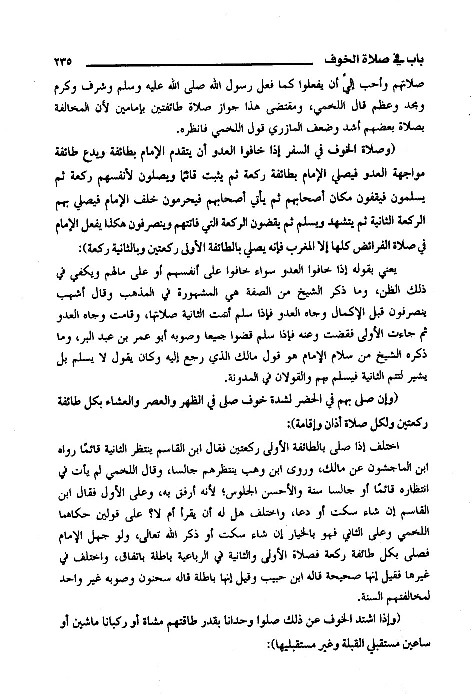صلاتهم وأحب إلي أن يفعلوا كما فعل رسول الله صلى الله عليه وسلم وشرف وكرم ومجد وعظم قال اللخمي، ومقتضى هذا جواز صلاة طائفتين بإمامين لأن المخالفة بصلاة بعضهم أشد وضعف المازري قول اللخمي فانظره.