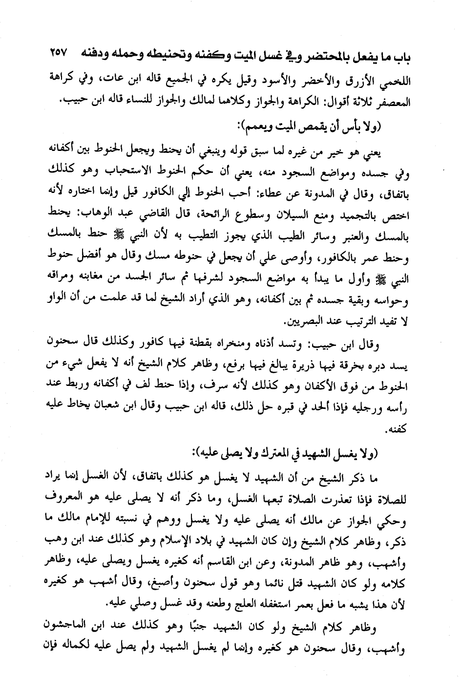 ما ذكر الشيخ من أن الشهي لا يغسل هو كذلك باتفاق، لأن الغسل إنما يراد للصلاة فإذا تعذرت الصلاة تبعها الغسل، وما ذكر أنه لا يصلى عليه هو المعروف وحكي الجوازعن مالك أنه يصلى عليه ولا يغسل ووهم في نسبته للإمام مالك ما ذكر، وظاهر كلام الشيخ وإن كان الشهيد في بلاد الإسلام وهو كذلك عند ابن وهب وأشهب، وهو ظاهر المدونة، وعن ابن القاسم أنه كغيره يغسل ويصلى عليه، وظاهر كلامه ولو كان الشهيد قتل نائما وهو قول سحنون وأصبغ، وقال أشهب هو كغيره لأن هذا يشبه ما فعل بعمر استغفله العلج وطعنه وقد غسل وصلي عليه.