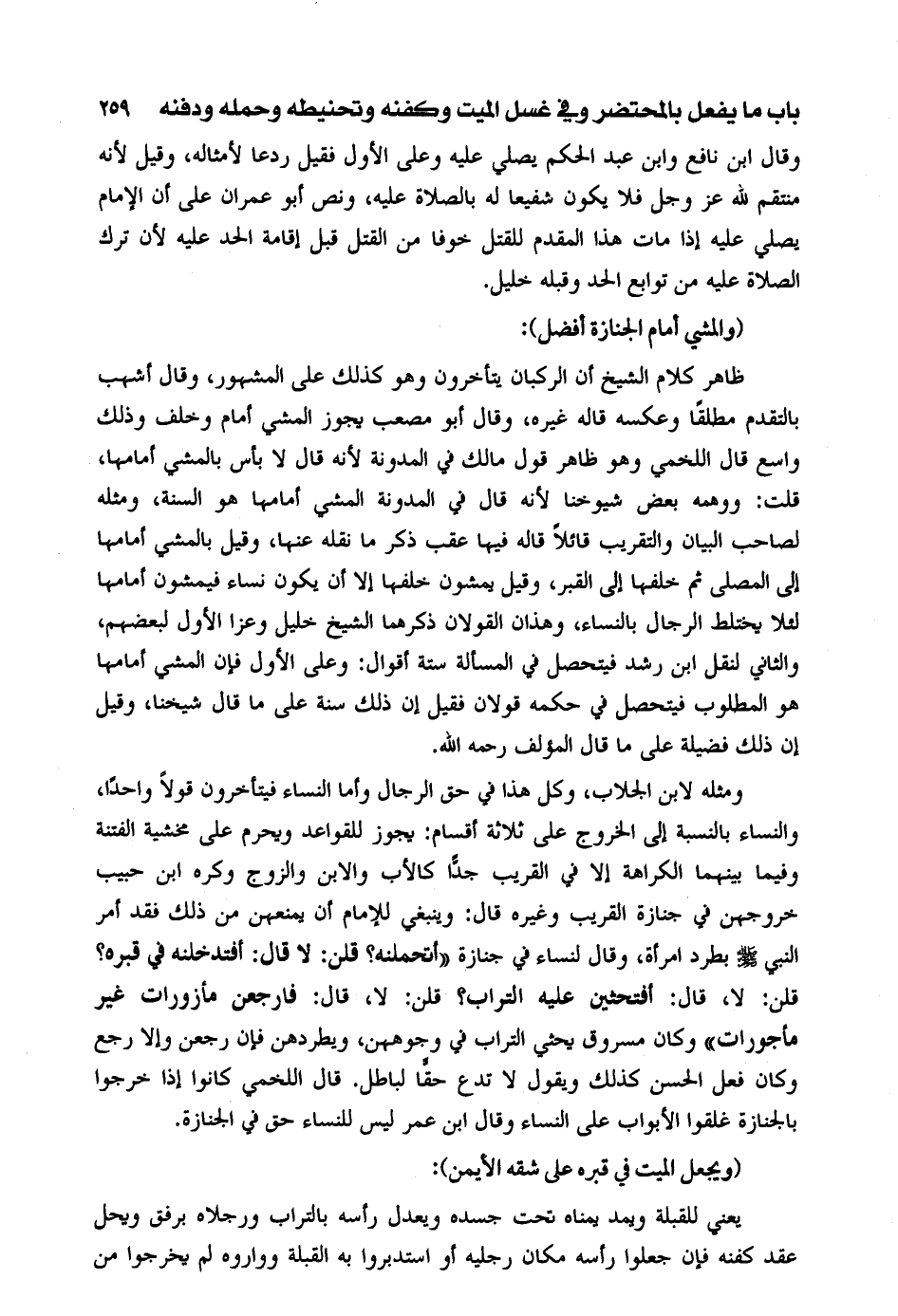 ومثله لابن الجلاب، وكل هذا في حق الرجال وأما النساء فيتأخرون قولا واحدا، والنساء بالنسبة إلى الخروج على ثلاثة أقسام: يجوز للقواعد ويحرم على مخشية الفتنة وفيما بينهما الكراهة إلا في القريب جدا كالأب والابن والزوج وكره ابن حبيب خروجهن في جنازة القريب وغيره قال: وينبغي للإمام أن يمنعهن من ذلك فقد أمر النبي صلى الله عليه وسلم بطرد امرأة، وقال لنساء في جنازة "أتحملنه؟ قلن: لا قال: أفتدخلنه في قبره؟ قلن: لا، قال: أفتحثين عليه التراب؟ قلن: لا، قال: فارجعن مأزورات غير مأجورات" وكان مسروق يحثي التراب في وجوههن، ويطردهن فإن رجعن وإلا رجع وكان فعل الحسن كذلك ويقول لا تدع حقا لباطل. وقال اللخمي كانوا إذا خرجوا بالجناز غلقوا الأبواب على النساء وقال ابن عمر ليس للنساء حق في الجنازة.