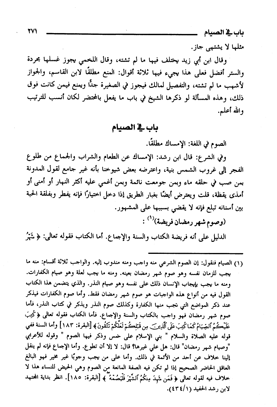 وفي الشرع: قال ابن رشد: الإمساك عن الطعام والشراب والجماع من طلوع الفجر إلى غروب الشمس بنية، واعترضه بعض شيوخنا بأنه غير جامع لقول المدونة بمن صب في حلقه ماء وبمن جومعت نائمة وبمن أغمي عليه أكثر نهار أو أمنى أو أمذى يقظة، قلت ويعترض أيضًا بغبار الطريق إذا دخل اختيارا فإنه يفطر وبفلقة الحبة بين أسنانه تبلع فإنه لا يقضي بسببها على المشهور.
