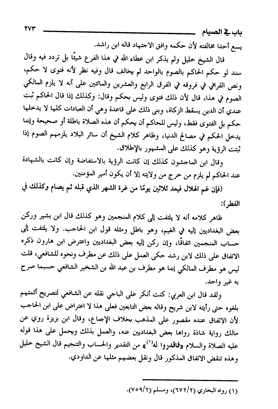 ولقد قال ابن العربي: كنت أنكر على الباجي نقله عن الشافعي لتصريح أئمتهم بلغوه حتى رأيته لابن شريح وقاله بعض التابعين فعلى هذا لا اعتراض على ابن الحاجب لأن الاتفاق عنده مقصور على المذهب بخلاف الإجماع، وقال ابن بزيزة روي عن مالك رواية شاذة رواها بعض البغداديين عنه، والعمل بذلك ويحمل على هذا قوله عليه الصلاة والسلام "فاقدروا له" من التقدير والحساب والتنجيم قال الشيخ خليل وهذه تنقض الاتفاق المذكور قال ونفل بعضهم مثلها على الداودي.