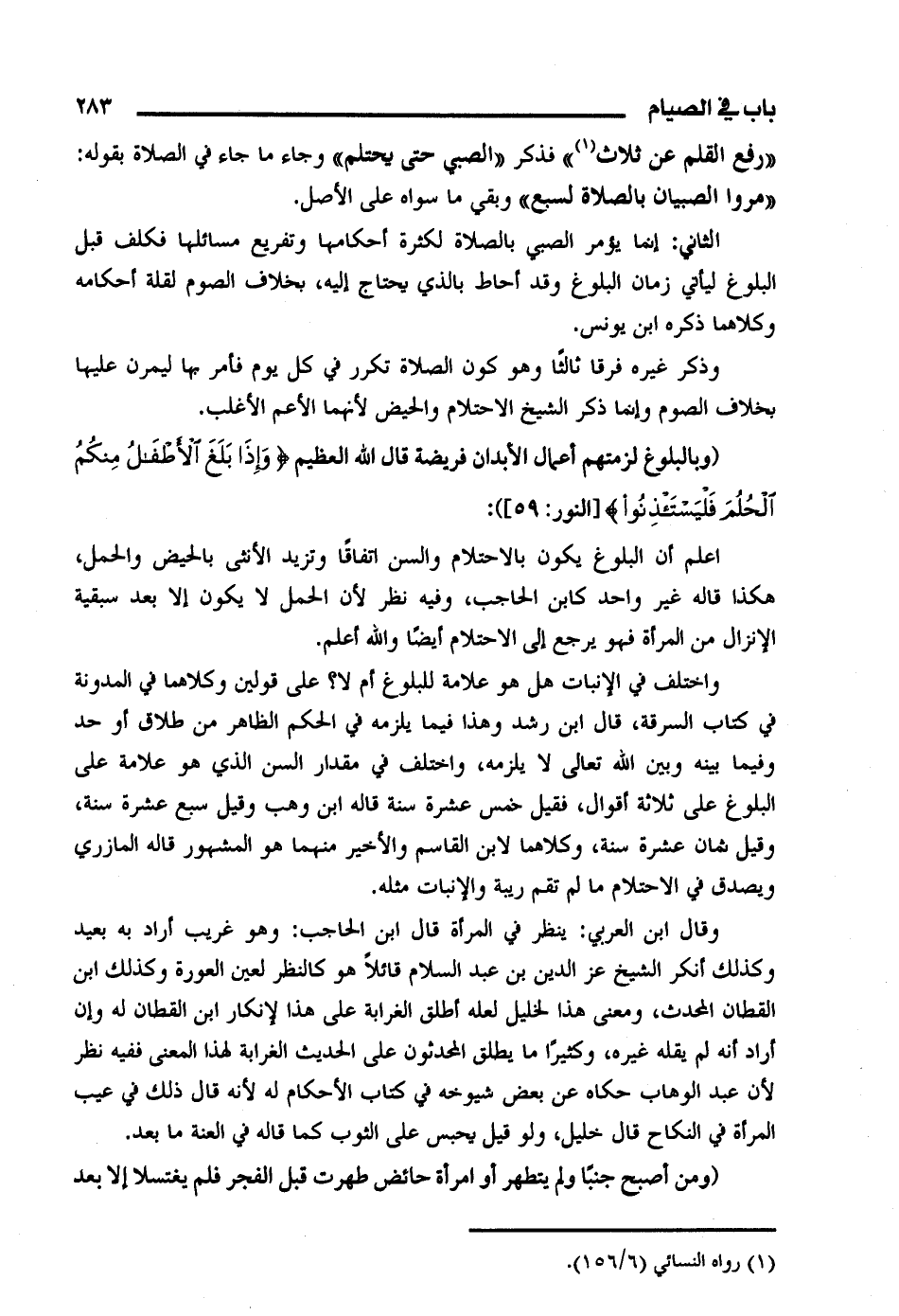 (وبالبلوغ لزمتهم أعمال الأبدان فريضة قال الله العظيم (وإذا بلغ الأطفال منكم الحلم فليستئذنوا) [النور: 59]).