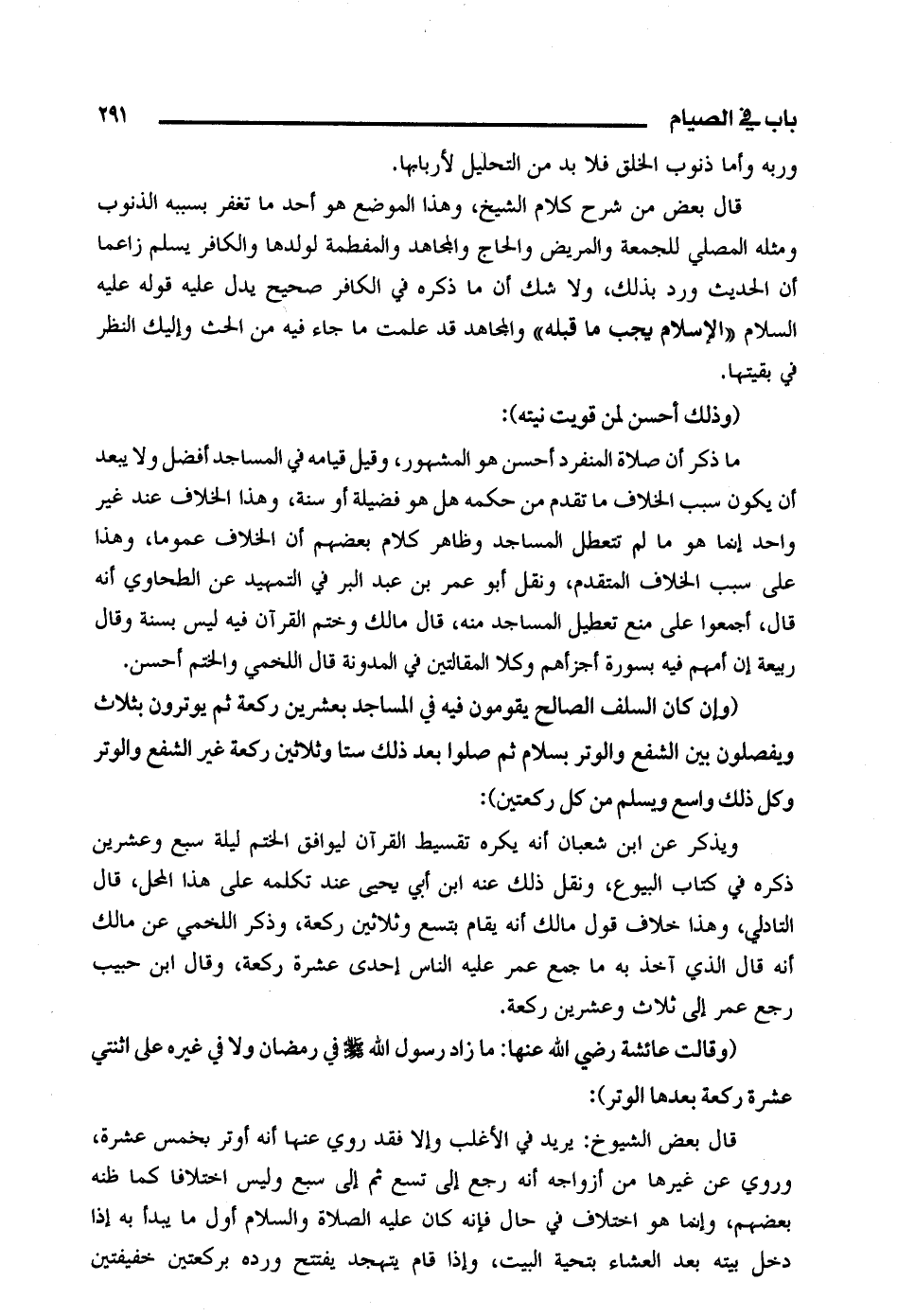 (وإن كان السلف الصالح يقومون فيه في المساج بعشرين ركعة ثم يوترون بثلاث ويفصلون بين الشفع والوتر بسلام ثم صلوا بعد ذلك ستا وثلاثين ركعة غير الشفع والوتر وكل ذلك واسع ويسلم من كل ركعتين):