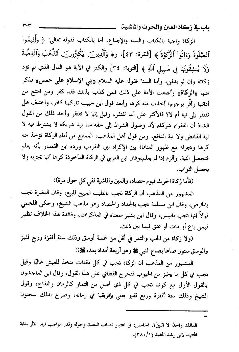 والكنز في الآية هو المال الذي لم تؤد زكاته وإن لم يدفن، وأما السنة فقوله عليه السلام "بني الإسلام على خمس" فذكر منها "الزكاة" وأجمعت الأمة على ذلك فمن كذب بذلك فقد كفر ومن امتنع من أدائها وأقر بوجوبها أخذت منه كرها وأبعد قول ابن حبيب تاركها كافر، واختلف هل تفتقر إلى نية أم لا؟ فالأكثر على أنها تفتقر، وقيل إنها لا تفتقر وأخذ ذلك من القول الشاذ أن الفقراء شركاء لأن وصول الشرط إلى حقه مما بيد شريكه لا يشترط فيه لا نية القابض ولا نية الدافع، ومن قول أهل المذهب: الممتنع من أداء الزكاة تؤخذ منه كرها وتجزئه مع ظهور المنافاة بين الإكراه بين التقريب ورده ابن القصار بأنه يعلم فنحصل النية، وألزم إذا لم يعلم، وقال ابن العربي في الزكاة المأخوذة كرها أنها تجزيه ولا يحصل الثواب.