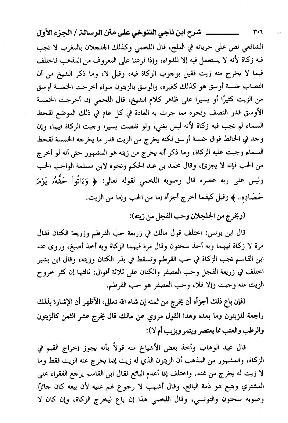 الشافعي نص على جريانه في الملح، قال اللخمي، وكذلك الجلجلان بالمغرب لا تجب فيه زكاة لأنه لا يستعمل فيه إلا للدواء، وإذا فرعنا على المعروف من المذهب فاختلف فيما لا يخرج منه زيت فقيل بوجوب الزكاة فيه، وقيل لا، وما ذكر الشيخ من أن النصاب خمسة أو سق هو كذلك كغيره، والوسق بالزيتون سواء أخرجت الخمسة أوسق من الزيت كثيراً او يسيراً على ظاهر كلام الشيخ، قال اللخمي إن أخرجت الخمسة الأوسق قدر النصف ونحوه مما جرت به العادة في كل عام في ذلك الموضع لقحط السماء لم تجب فيه زكاة لأنه ليس يغني، ولو نقصت يسيراً وجبت الزكاة فيها، وان وجد في الحائط فوق خمسة أوسق لكنه يخرج من الزيت قدر ما يخرجه الخمسة لقحط السماء وجبت عليه الزكاة، وما ذكر أنه يخرج من زيته هو المشهور حتى أنه لو أخرج من الحب فإنه لا يجزئ، وقال محمد بن عبدالحكم ونحوه لابن مسلمة الواجب الحب وليس على ربه عصره قال وصوبه اللخمي لقوله تعالى: (وآتوا حقه يوم حصاده) وقيل كيفما أخرج أجزأه إما من الحب وإما من الزيت.