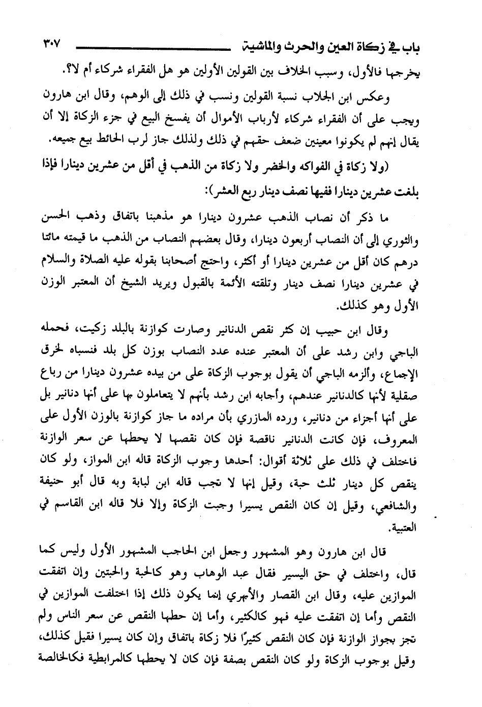 وعكس ابن الجلاب نسبة القولين ونسب في ذلك الى الوهم، وقال ابن هارون ويجب على أن الفقراء شركاء لأرباب الأموال أن يفسخ البيع في جزء الزكاة إلا أن يقال أنهم لم يكونوا معينين ضعف حقهم في ذلك ولذلك جاز لرب الحائط بيع جميعه.