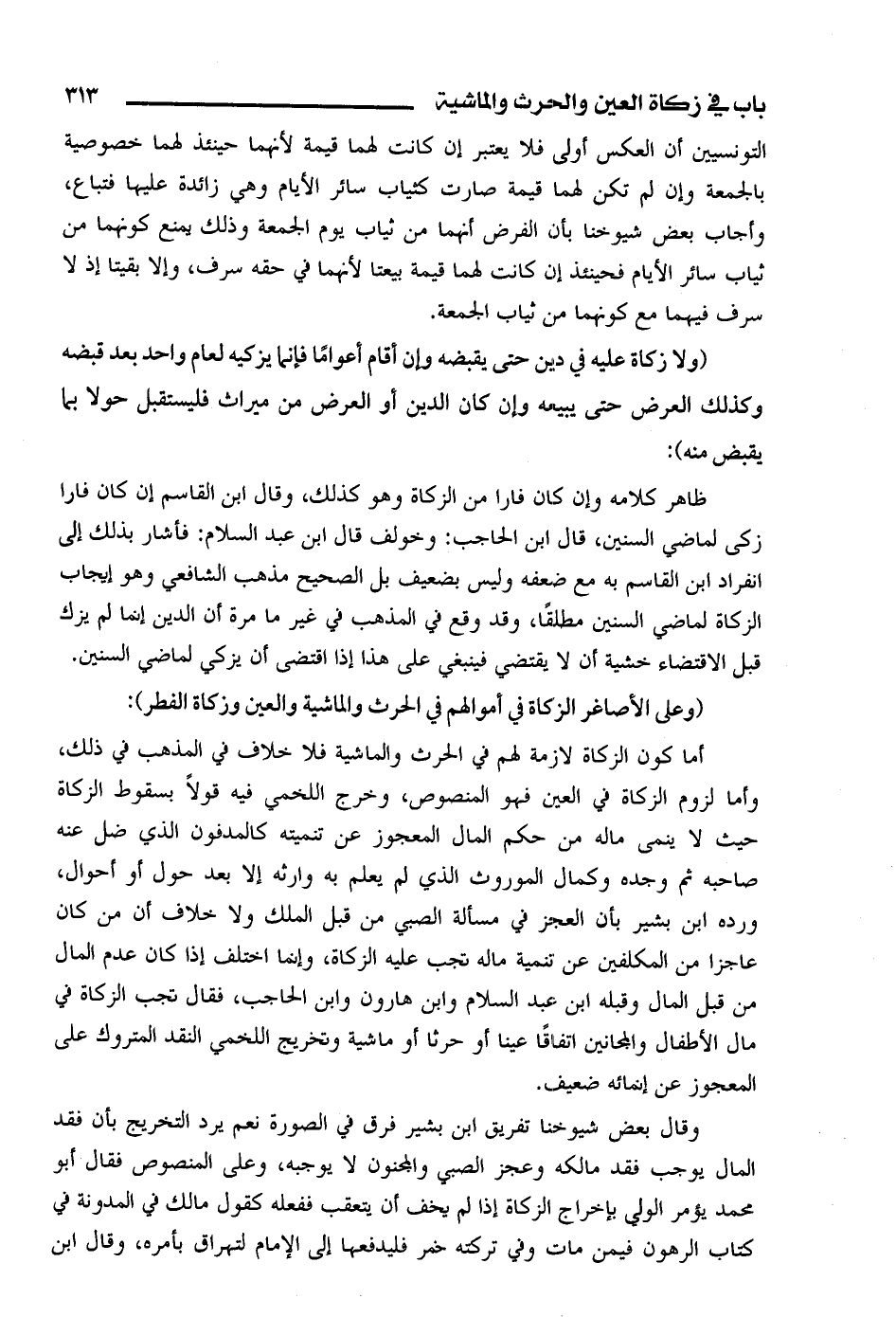 أما كون الزكاة لازمة لهم في الحرث والماشية فلا خلاف في المذهب في ذلك، وأما لزوم الزكاة في العين فهو المنصوص، وخرج اللخمي فيه قولاً بسقوط الزكاة حيث لا ينمي ماله من حكم المال المعجوز عن تنميته كالمدفون الذي ضل عنه صاحبه ثم وجده وكمال الموروث الذي لم يعلم به واره إلا بعد حول أو أحوال، ورده ابن بشير بأن العجز في مسألة الصبي من قبل الملك ولا خلاف أن من كان عاجزاً من المكلفين عن تنمية ماله تجب عليه الزكاة، وإنما اختلف إذا كان عدم المال من قبلا لمال وقبله ابن عبد السلام وابن هارون وابن الحاجب، فقال تجب الزكاة في مال الأطفال والمجانين اتفاقاً عينا أو حرثا أو ماشية وتخريج اللخمي النقد المتروك على المعجوز عن إنمائه ضعيف.