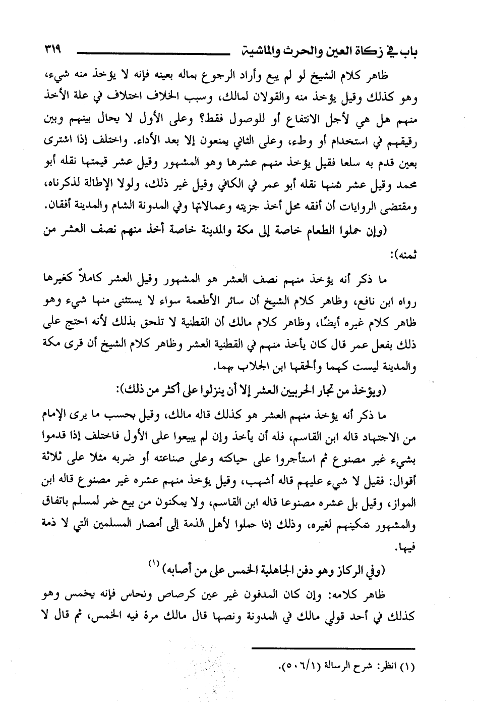 ما ذكر أنه يؤخذ منهم نصف العشر هو المشهور وقيل العشر كاملاً كغيرها رواه ابن نافع، وظاهر كلام الشيخ إن سائر الأطعمة سواء لا يستثني منها شئ وهو ظاهر كلام غيره أيضا، وظاهر كلام مالك أن القطنية لا تلحق بذلك لأنه احتج على ذلك بفعل عمر قال كان يأخذ منهم في القطنية العشر وظاهر كلام الشيخ أن قرى مكة والمدينة ليست كهما وألحقها ابن الجلاب بهما.