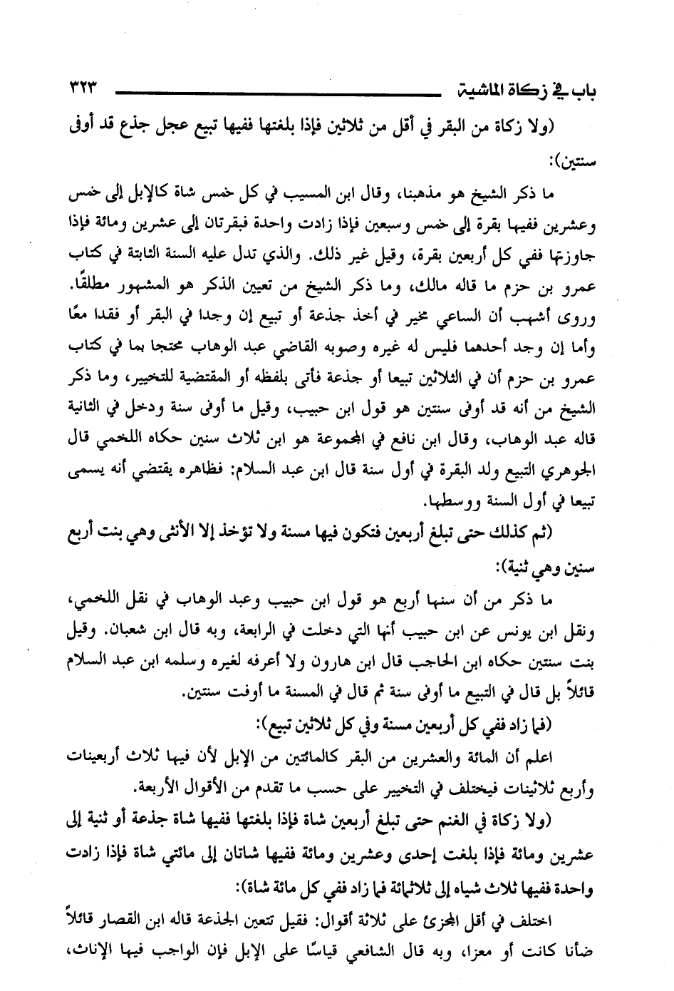 ما ذكر الشيخ هو مذهبنا، وقال ابن المسيب في كل خمس شاة كالإبل إلى خمس وعشرين ففيها بقرة إلى خمس وسبعين فإذا زادت واحدة فبقرتان إلى عشرين ومائة فإذا جاوزتها ففي كل أربعين بقرة وقيل غير ذلك. والذي تدل عليه السنة الثابتة في كتاب عمرو بن حزم ما قاله مالك، وما ذكر الشيخ من تعيين الذكر هو المشهور مطلقًا. وروى أشهب أن الساعي مخير في أخذ جذعة أو تبيع إن وجدا في البقر أو فقدا معًا وأما إن وجد أحدهما فليس له غيره وصوبه القاضي عبد الوهاب محتجا بما في كتاب عمرو بن حزم أن في الثلاثين تبيعا أو جذعة فأتى أو المقتضية للتخيير، وما ذكر الشيخ من أنه في أوفي سنتين هو قول ابن حبيب، وقيل ما أوفي سنة ودخل في الثانية قاله عبد الوهاب، وقال ابن نافع في المجموعة هو ابن ثلاث سنين حكاه اللخمي قال الجوهري التبيع ولد البقرة في أول سنة قال ابن عبد السلام: فظاهره يقتضي أنه يسمي تبيعا في أول السنة ووسطها.