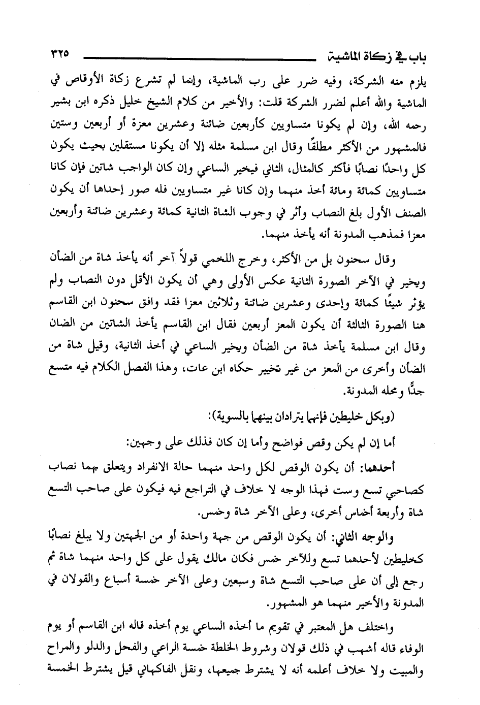 يلزم منه الشركة، وفيه ضرر على رب الماشية، وإنما لم تشرع زكاة الأوقاص في الماشية والله أعلم لضرر الشركة قلت: والأخير من كلام الشيخ خليل ذكره ابن بشير رحمه الله، وإن لم يكونا متساويين كأربعين ضائنة وعشرين معزة أو أربعين وستين فالمشهور من الأكثر مطلقا وقال ابن مسلمة مثله إلا أن يكونا مستقلين بحيث يكون كل واحدًا نصابًا فأكثر كالمثال، الثاني فيخير الساعي وإن كان الواجب شاتين فإن كانا متساويين كمائة ومائة أخذ منهما وإن كانا غير متساويين فله صور إحداهما أن يكون الصنف الأول بلغ النصاب وأثر في وجوب الشاة الثانية كمائة وعشرين ضائنة وأربعين معزا فمذهب المدونة أنه يأخذ منهما.