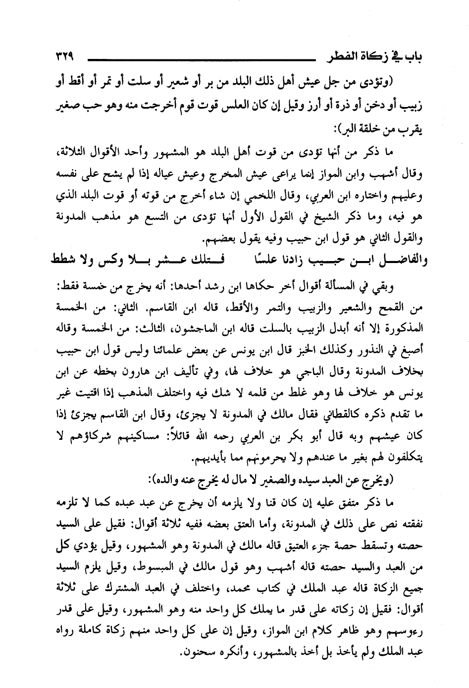 ما ذكر متفق عليه إن كان قنا ولا يلزمه أن يخرج عن عبد عبده كما لا تلزمه نفقته نص على ذلك في المدونة، وأما العتق بعضه ففيه ثلاثة أقوال: فقيل على السيد حصته وتسقط حصة جزء العتيق قال مالك في المدونة وهو المشهور، وقيل يؤدي كل من العبد والسيد حصته قاله أشهب وهو قول مالك في المبسوط، وقيل يلزم السيد جميع الزكاة قاله عبد الملك في كتاب محمد، واختلف في العبد المشترك على ثلاثة أقوال: فقيل إن زكاته على قدر ما يملك كل واحد منه وهو المشهور، وقيل على قدر رءوسهم وهو ظاهر كلام ابن المواز، وقيل إن على كل واحد منهم زكاة كاملة رواه عبد الملك ولم يأخذ بل أخذ بالمشهور، وأنكره سحنون.