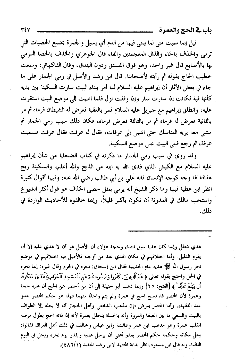 قيل إنما سميت منى لما يمني فيها من الدم أي يسيل والجمرة مجتمع الحصيات التي ترمى والخذف بالخاء والذال المعجمتين والفاء قال الجوهري والخذف بالحصا المرمي بها بالأصابع قال غير واحد، وهو فوق الفستق ودون البندق، وقال الفاكهاني: وسمعت خطيب الحاج يقوله ثم رأيته لأصحابنا. قال ابن رشد والأصل في رمي الجمار على ما جاء في بعض الآثار أن إبراهيم عليه السلام لما أمر ببناء البيت سارت السكينة بين يديه كأنها قبة فكانت إذا سارت سار وإذا وقفت نزل فلما انتهت إلى موضع البيت استقرت عليه، وانطلق إبراهيم مع جبريل عليه السلام فمر بالعقبة فعرض له الشيطان فمراه ثم مر بالثانية فعرض له فرماه ثم مر بالثالثة فعرض فرماه، فكان ذلك سبب رمي الجمار ثم مشى معه يريه المناسك حتى انتهى إلى عرفات، فقال له عرفت فقال عرفت فسميت عرفه، ثم رجع فبني البيت على موضع السكينة.