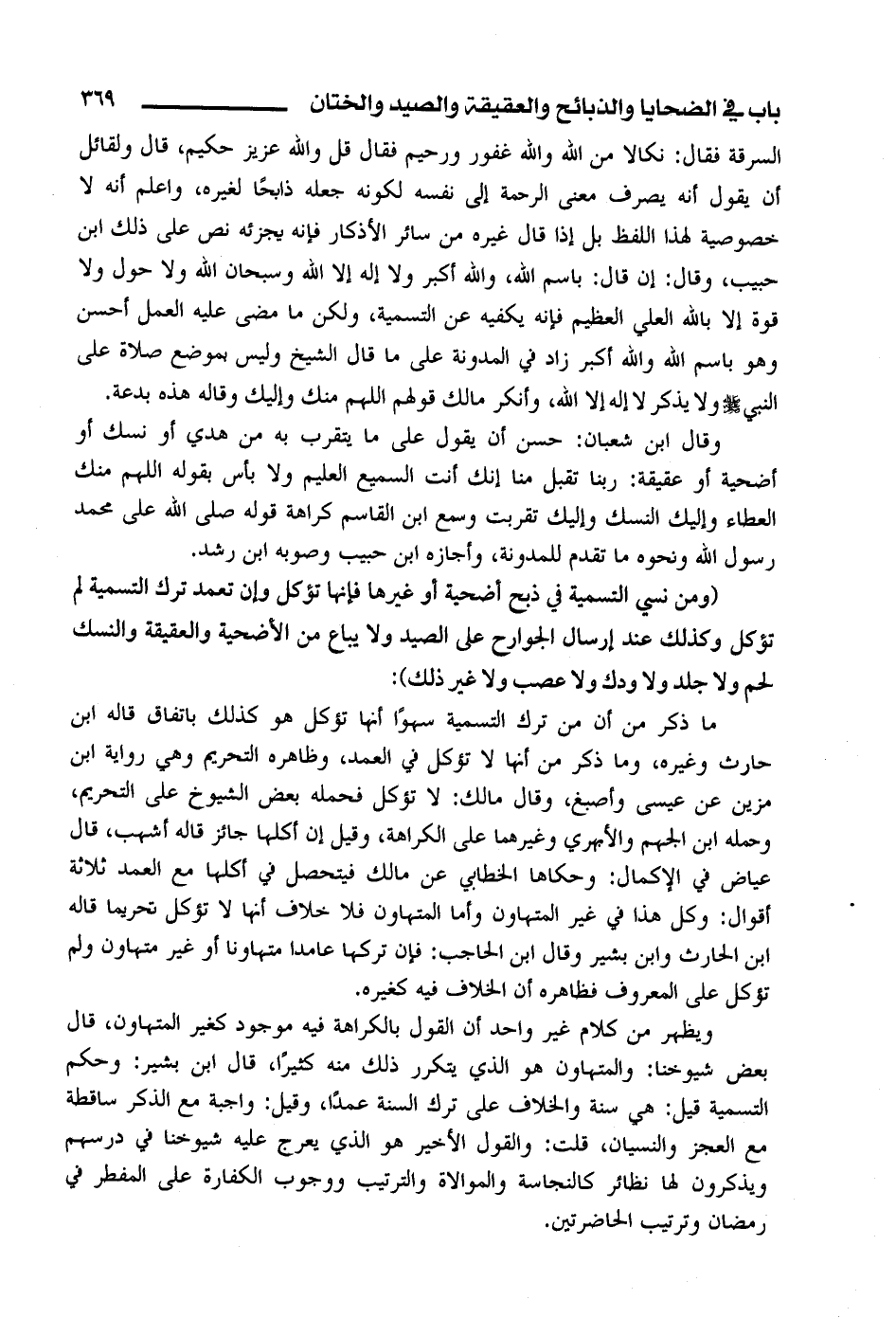 السرقة فقال: نكالا من الله والله غفور رحيم فقال قل والله عزيز حكيم، قال ولقائل أن يقول أنه يصرف معنى الرحمة إلى نفسه لكونه جعله ذابحًا لغيره، واعلم أنه لا خصوصية لهذا اللفظ بل إذا قال غيره من سائر الأذكار فإنه يجزئه نص على ذلك ابن حبيب، وقال: إن قال: باسم الله، والله أكبر ولا إله إلا الله وسبحان الله ولا حول ولا قوة إلا بالله العلي العظيم فإنه يكفيه عن التسمية، ولكن ما مضي عليه العمل أحسن وهو باسم الله والله أكبر زاد في الدونة على ما قال الشيخ وليس بموضع صلاة على النبي صلى الله عليه وسلم ولا يذكر لا إله إلا الله، وأنكر مالك قولهم اللهم منك وإليك قاله هذه بدعة.
