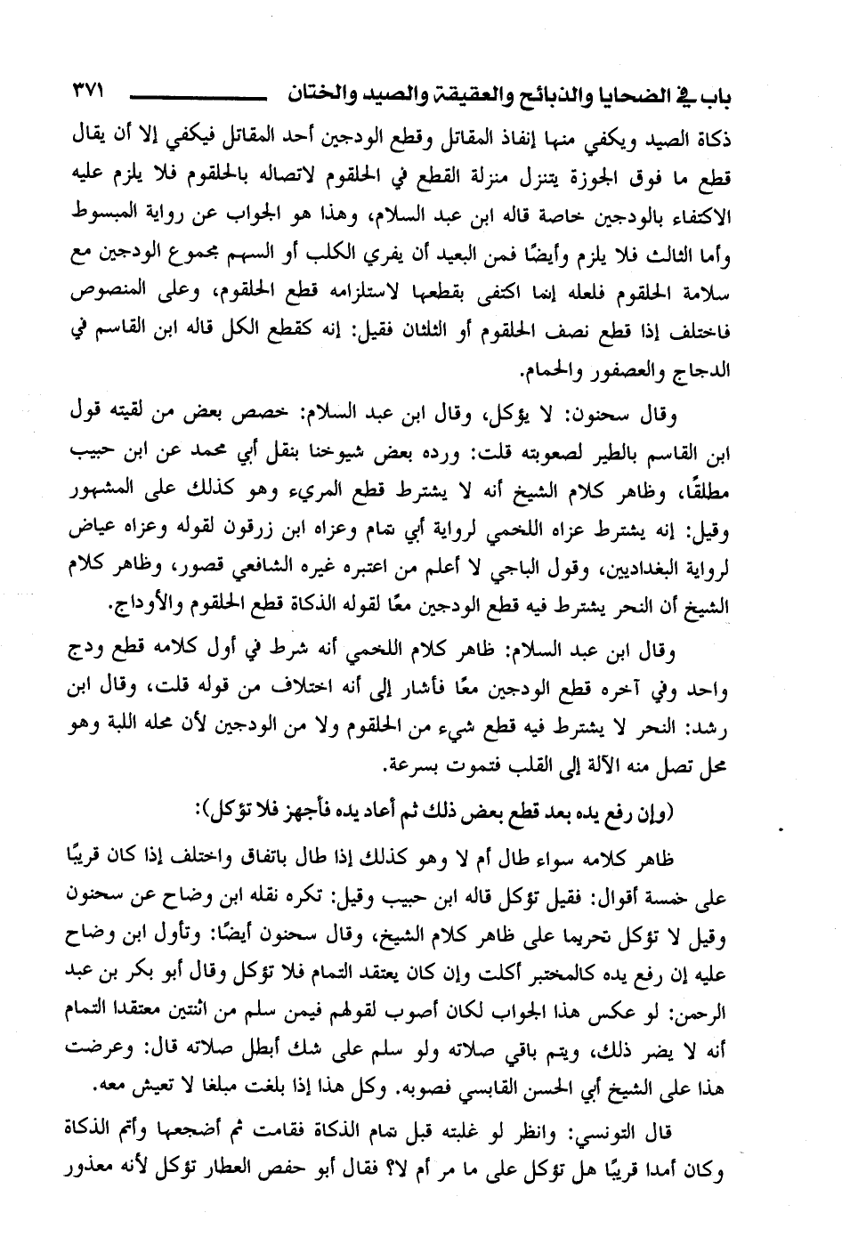 وقال سحنون: لا يؤكل، وقال ابن عبد السلام: خصص بعض من لقيته قول ابن القاسم بالطير لصعوبته قلت: ورده بعض شيوخنا بنقل أبي محمد عبد ابن حبيب مطلقًا، وظاهر كلام الشيخ أنه لا يشترط قطع المريء وهو كذلك على المشهور وقيل: إنه يشترط عزاه اللخمي لرواية أبي تمام وعزاه ابن زرقون لقوله وعزاه عياض لرواية البغداديين، وقول الباجي لا أعلم من اعتبره غيره الشافعي قصور، وظاهر كلام الشيخ أن النحر يشترط فيه قطع الودجين معًا لقوله الذكاة قطع الحلقوم والأوداج.