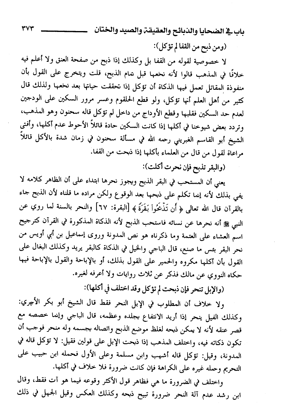 لا خصوصية لقوله من القفا بل وكذلك إذا ذبح من صفحة العنق ولا أعلم فيه خلافًا في المذهب قالوا لأنه نخعها قبل تمام الذبح، قلت ويتخرج على القول بأن منفوذة المقاتل تعمل فيها الذكاة أن تؤكل إذا تحققت حياتها بعد نخعها ولذلك قال كثير من أهل العلم أنها تؤكل، ولو قطع الحلقوم وعسر مرور السكين على الودجين لعدم حد السكين فقلبها وقطع الأوداج من داخل لم تؤكل قاله سحنون وهو المذهب، وتردد بعض شيوخنا في أكلها إذا كانت السكين حادة قائلاً الأحواط عدم أكلها، وأفتى الشيخ أبو القاسم الغبريني رحمه الله في مسألة سحنون في زمان شدة بالأكل قائلاً مراعاة لقول من قال من العلماء بأكلها إذا ذبحت من القفا.